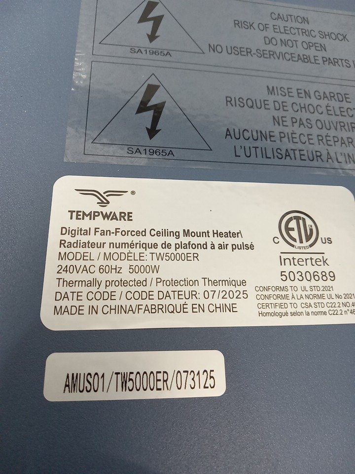 tempware Electric Garage Heater Digital Fan-Forced Ceiling Mount Shop Heater with Full-Function Remote - 5000W 240v - blue - (model:tw5000er)
