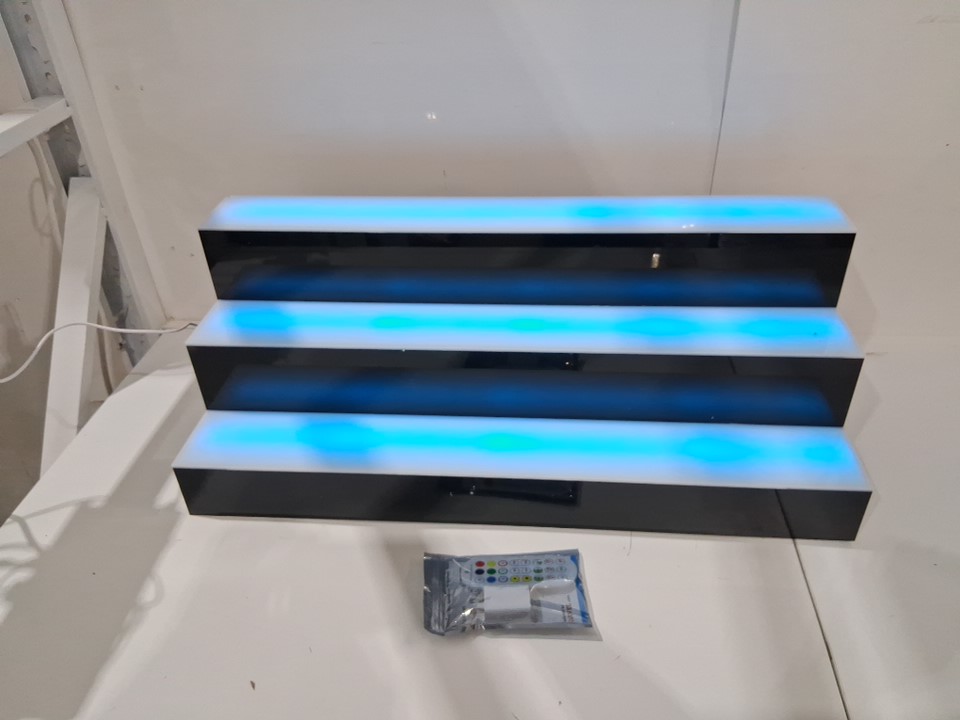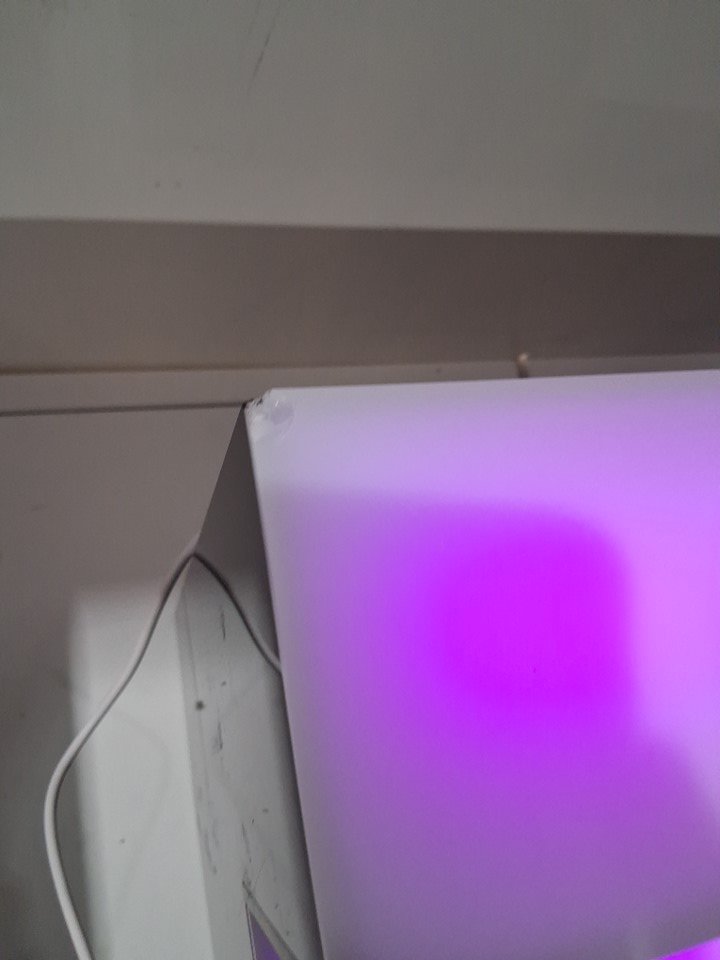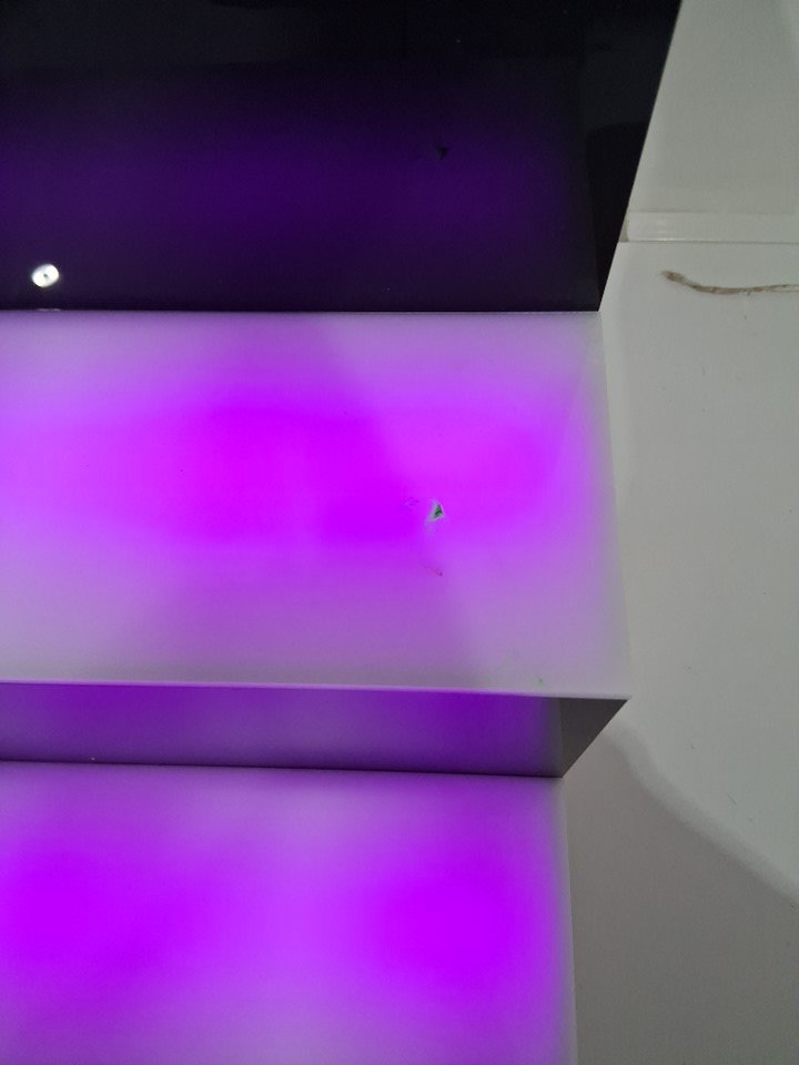 Light chipping at the back corner appears to be some light adhesive residue on the right side of the middle shelf