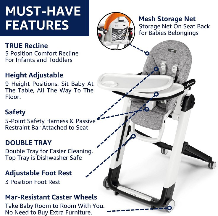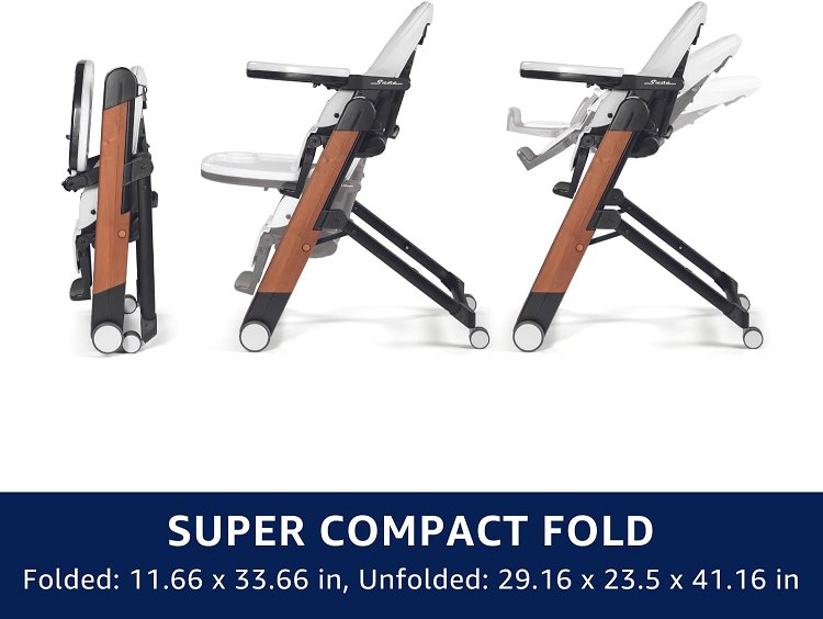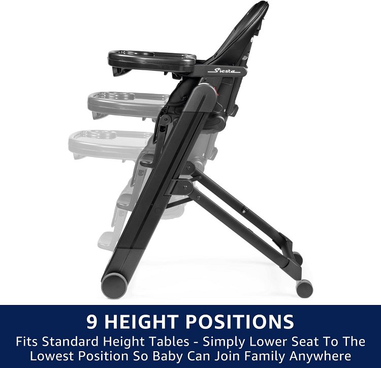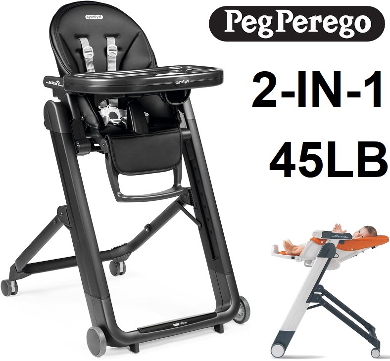 2-in-1 Peg Perego Siesta, Grow with Baby Folding High Chair & Recliner, Height Adjustable, Quick Claen & Easy Push Wheels for Babies & Toddlers - 45lb max load - true black (model: imsiesna03bl13t)