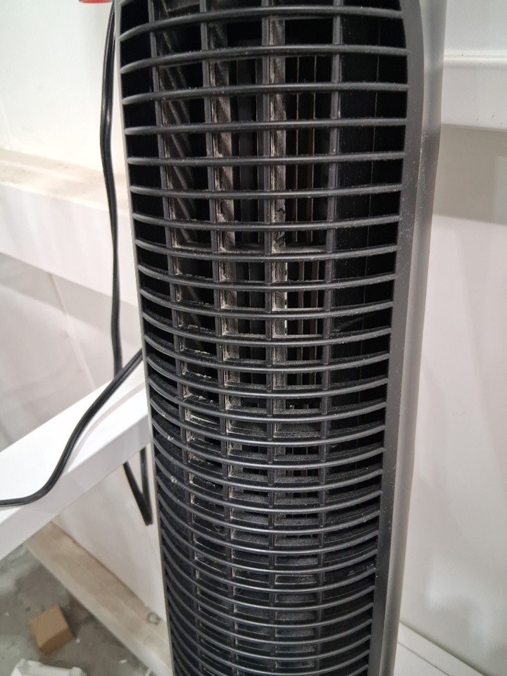 Fan has build up of dust on fan Tested for Power and Function *Fan rattles and seems to be loose inside chassis, may need maintenance*