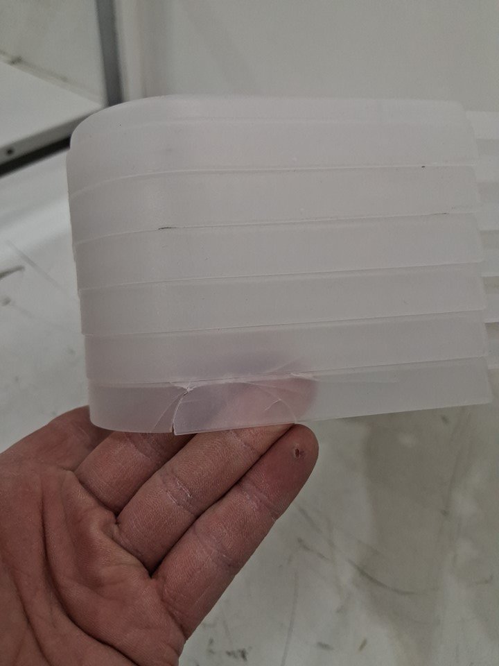 The corner of all six bins are cracked and damaged to varying degrees however only one bin corner is cracked.