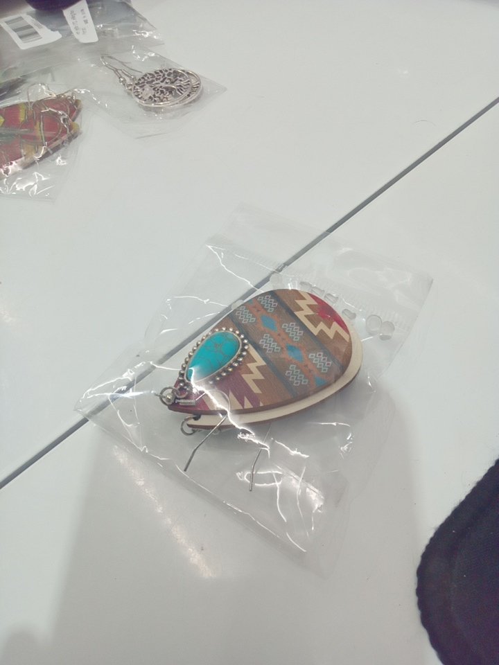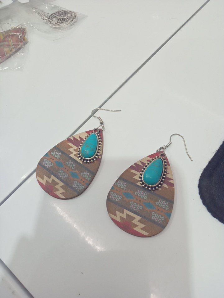 womens wood western style teardrop earrings -brown/red with turquoise
