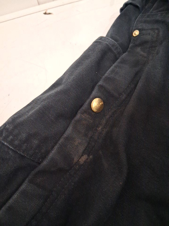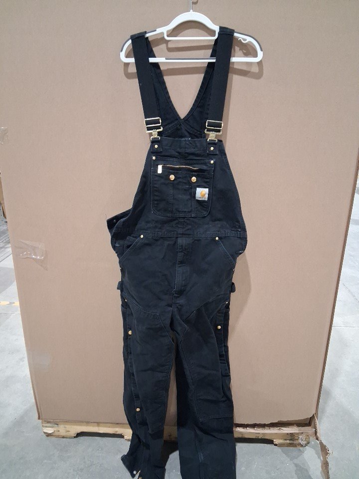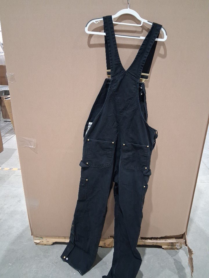 overalls have dirt stains and are slightly faded from previous wear/wash