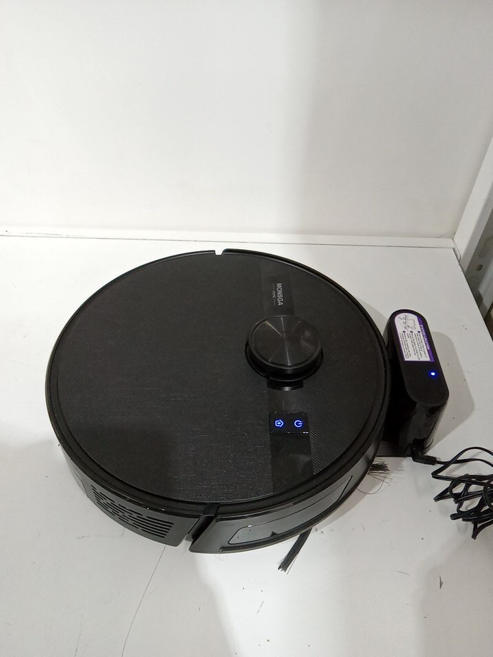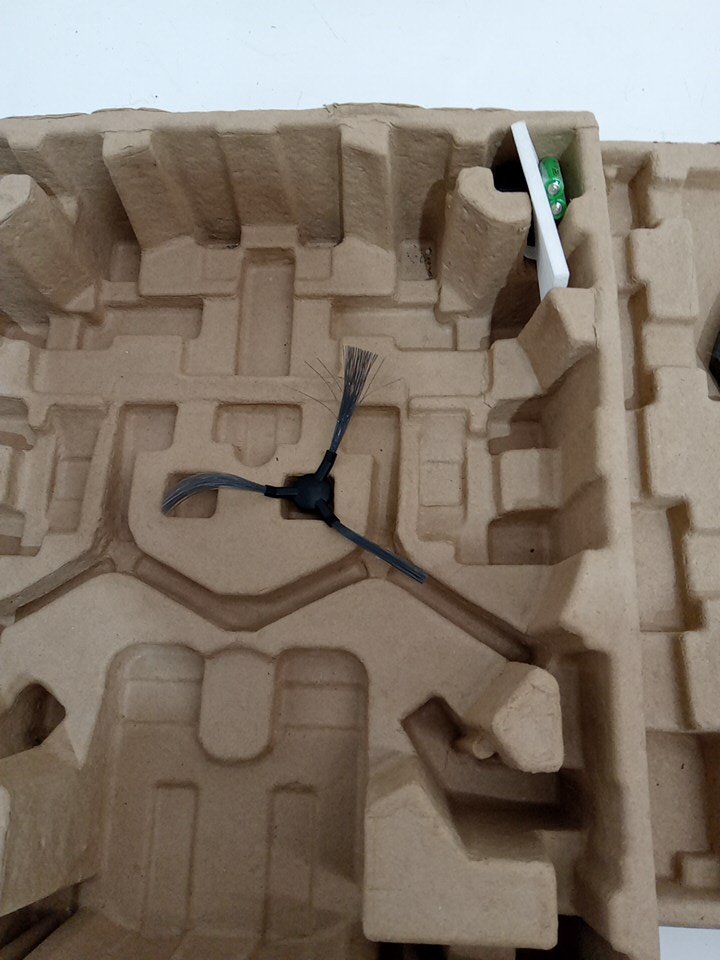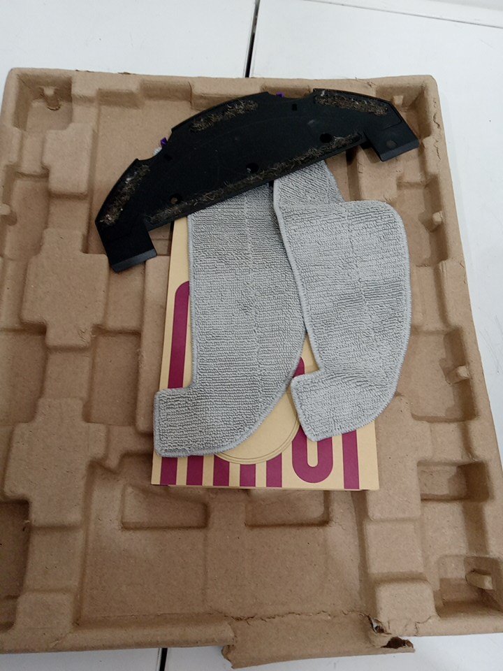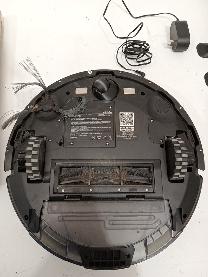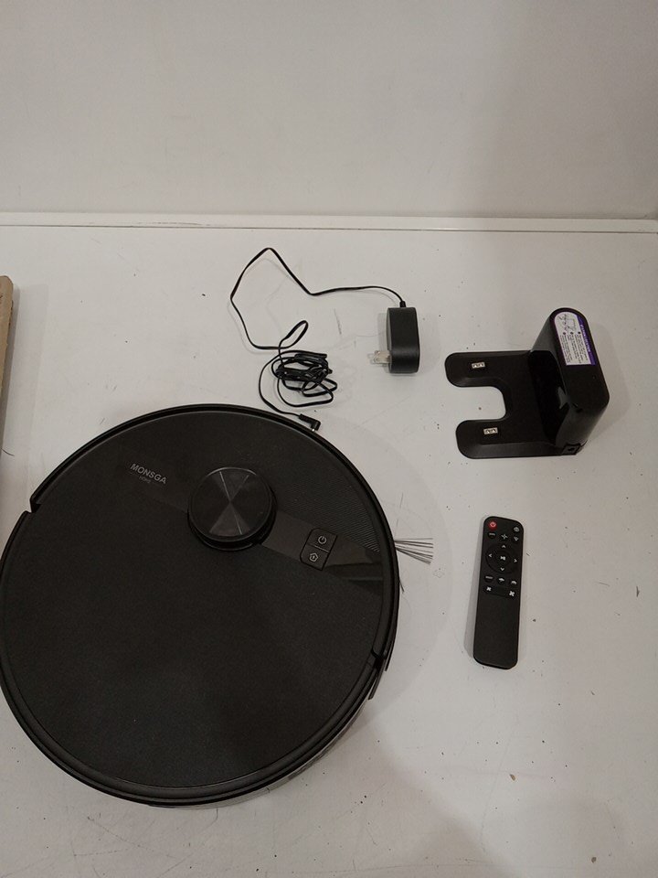 Item tested for power, charging and basic functionality via the buttons on the robot vacuum and the included remote control. The one side brush is moderately worn as a result from previous use. There is wear on the mop pads and main brush as well. There is dust/debris on/inside the robot vacuum and on the small base docking station. See attached photos for everything included with the item.
