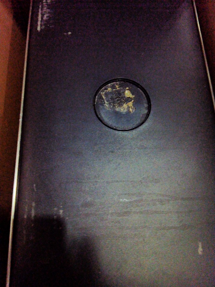 There is dirt/debris on the outside and inside. There are some shallow dents along the sides and one of the inner bins is missing. (SEE PHOTOS)