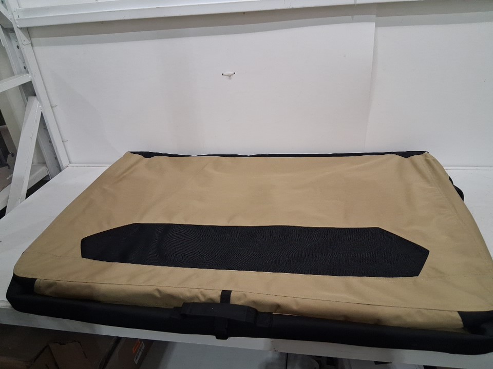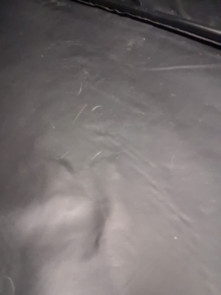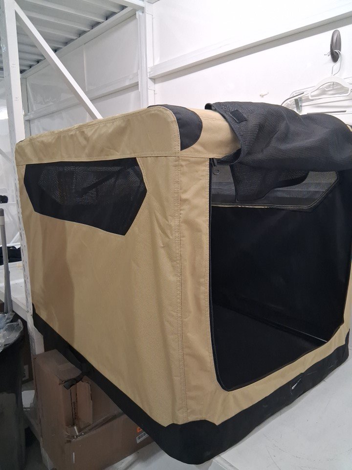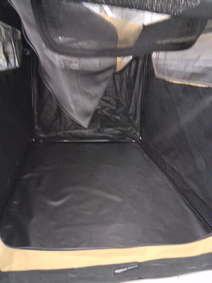 Travel crate has white streak stains on edges of crate, inside has loose pet hair and some dirt stains