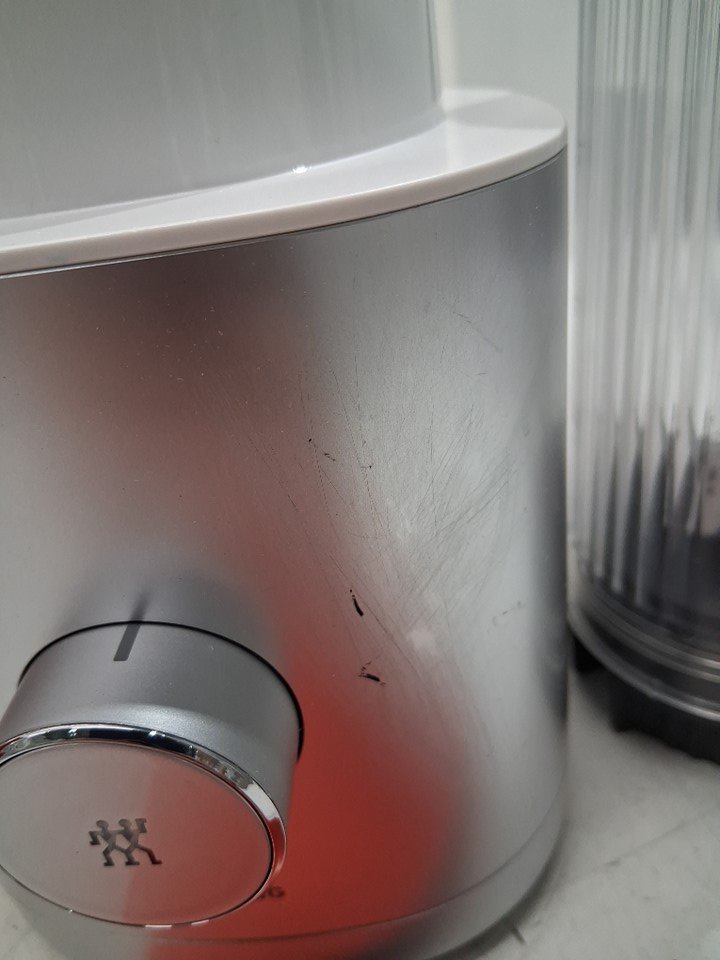 Tested for power, there are scratches on the outside of blender and food residue on the inside and on attachment for blender, please all photos.
