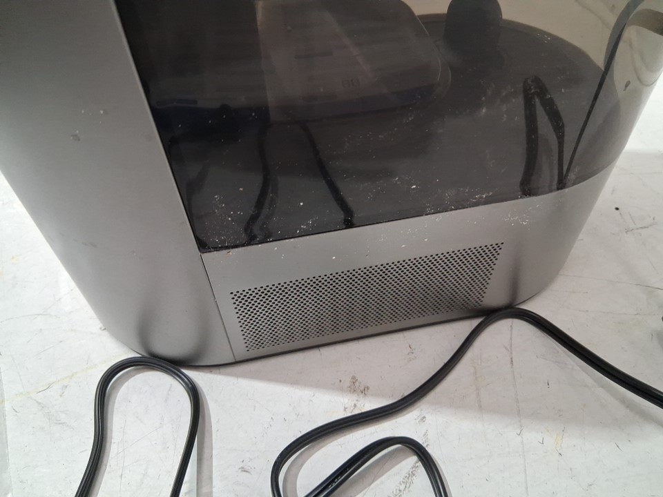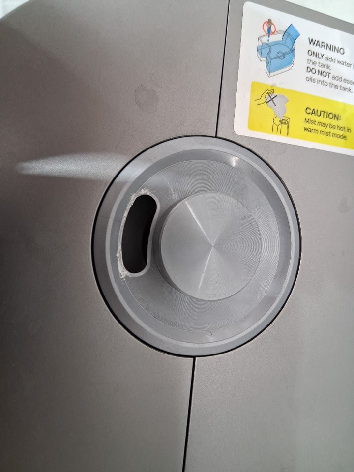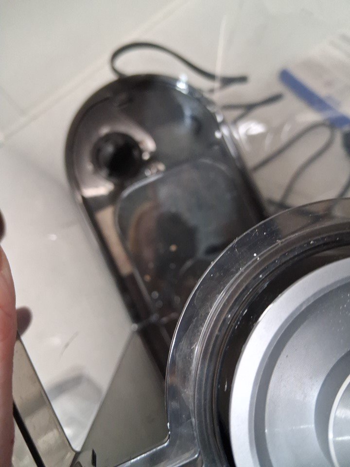 item has hard water residue, markings on water tank and debris inside, item also has some white debris on side