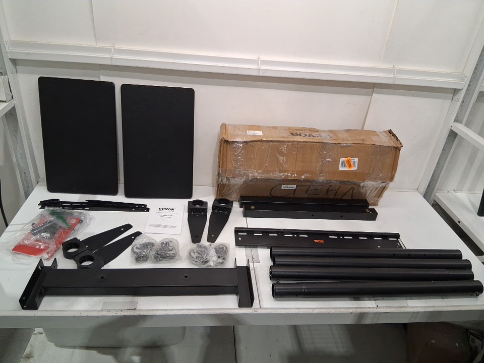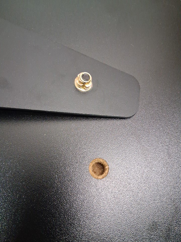 The stand appears to have been previously assembled. Please note that one of the metal screw hole inserts has come out, but it appears that it can be screwed/glued back into place and remain functional (see photos)