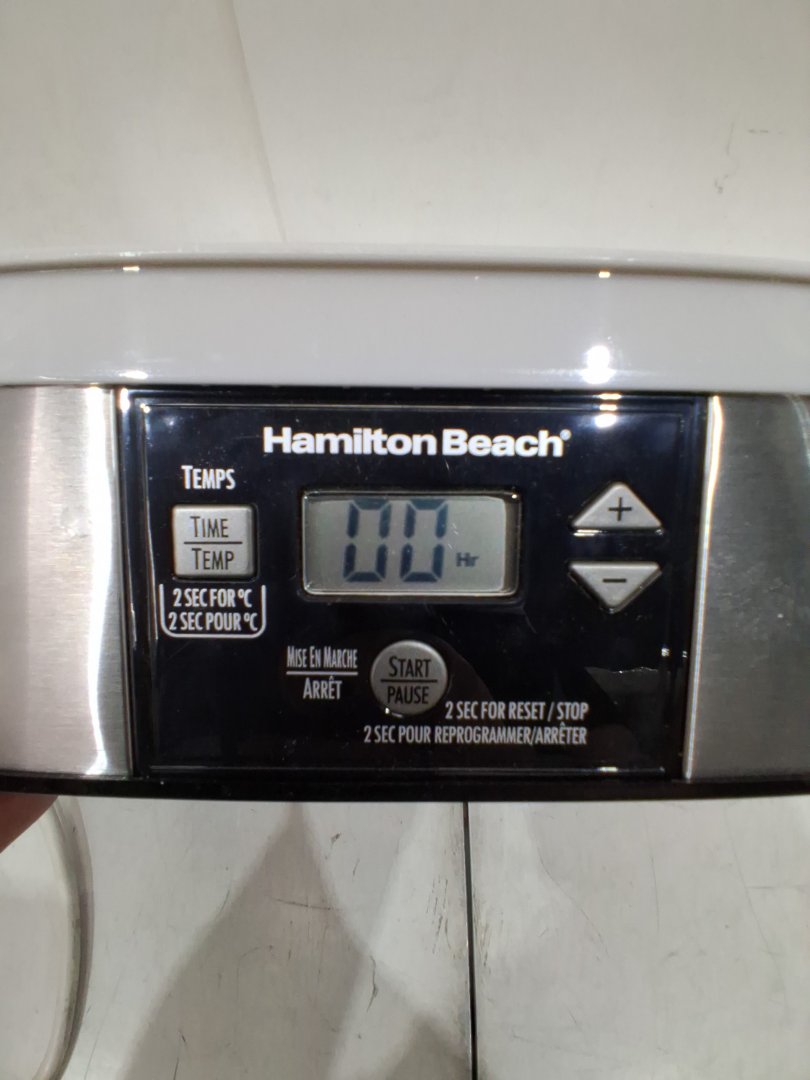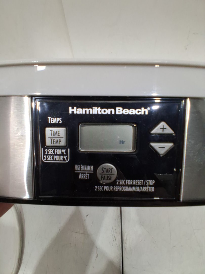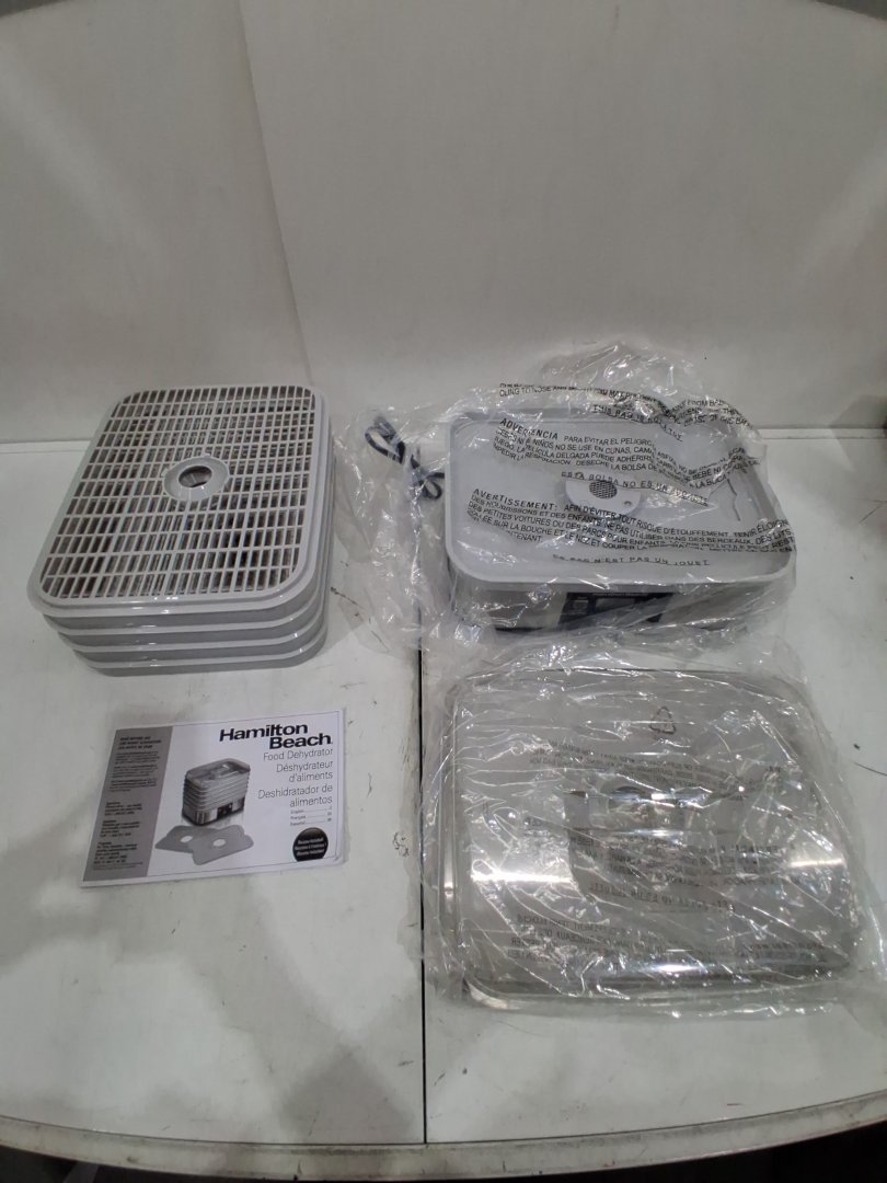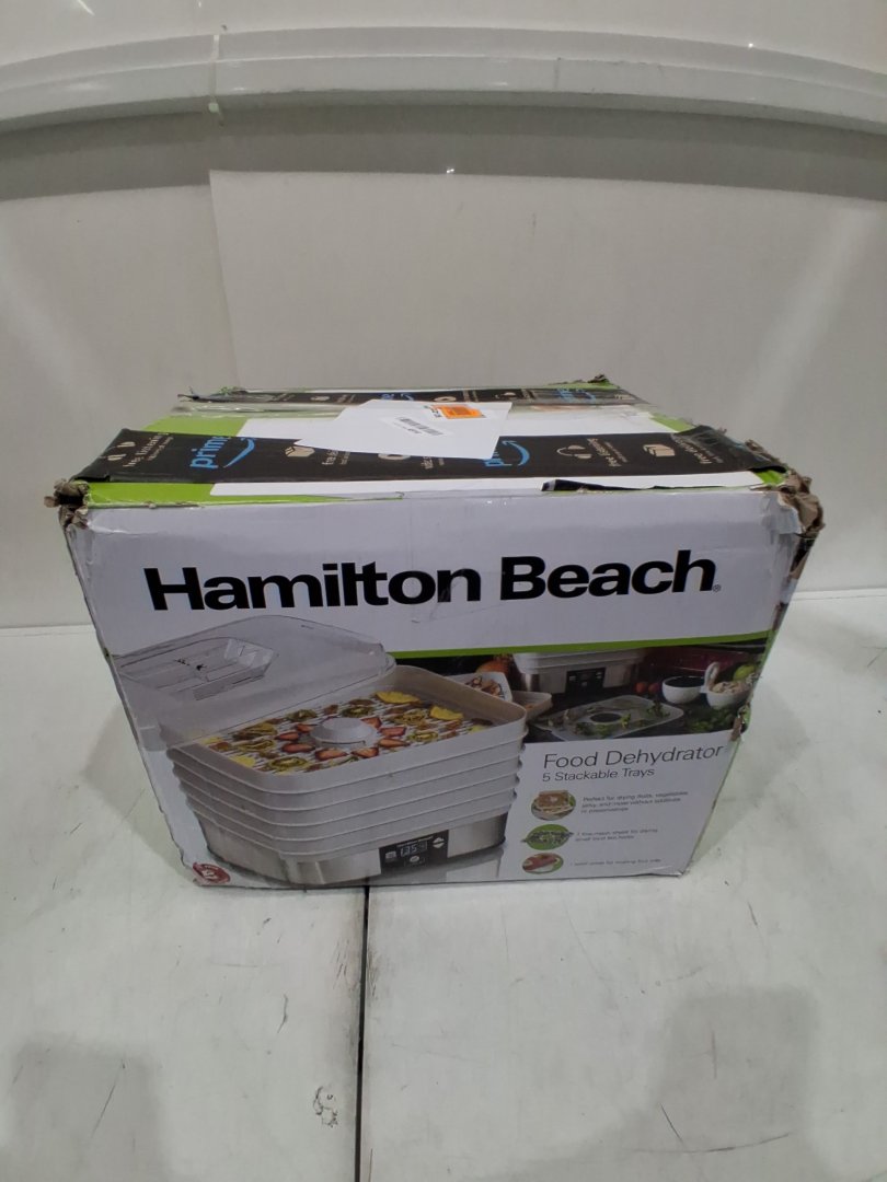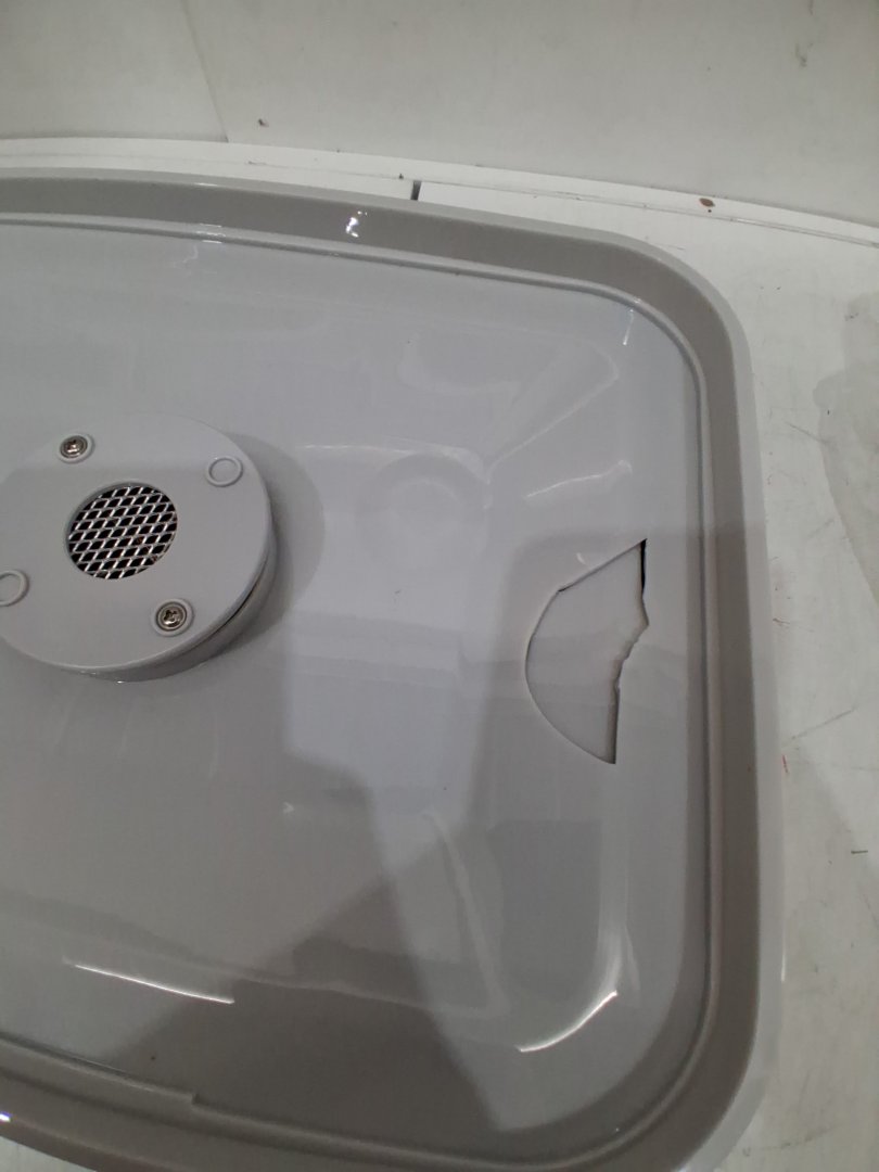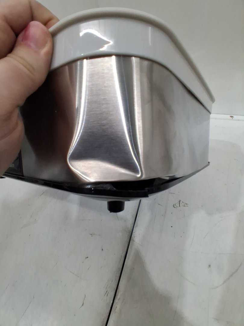 Item has a dent and small opening from a dent on stainless steel edge/corner of unit and a small crack/indent on inside plastic surface. Item tested for power.