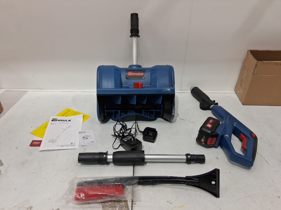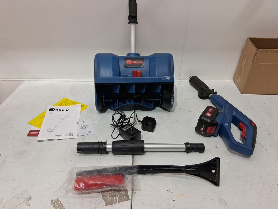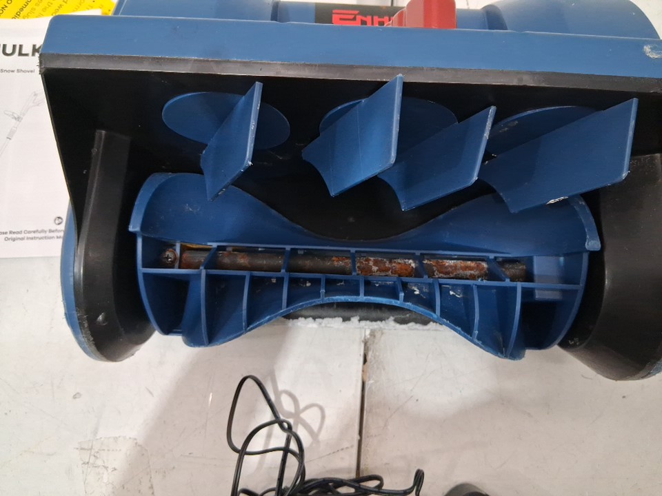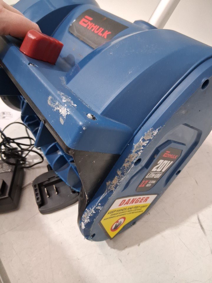 handles have markings from previous use, item has rust, hard salt residue on blades and around, items plastic has some distressed marks. snow thrower is also missing charger but charger is replaceable ( see photos)