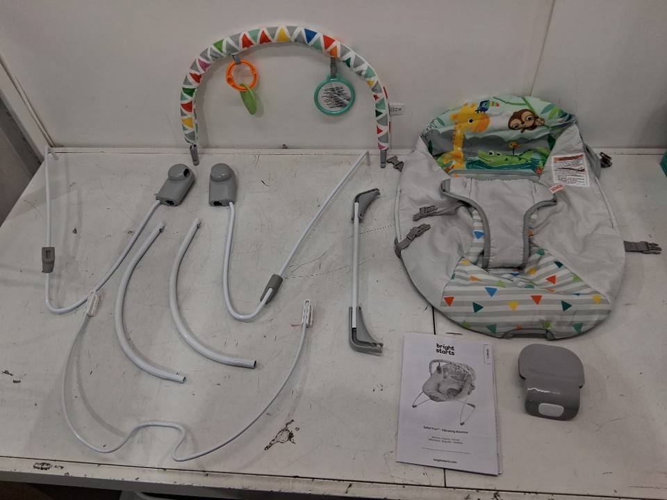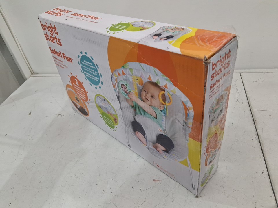 bright starts vibrating bouncer with 3-point harness and removable toy bar - 20lb max - safari fun (model: 12204)