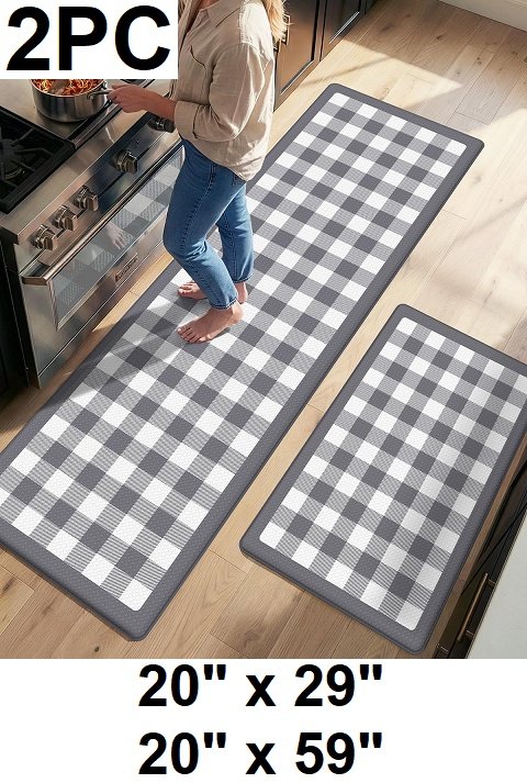 2pc dexi plaid checkered non-slip anti-fatigue waterproof kitchen mats - grey/white