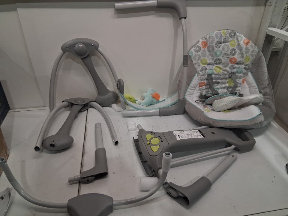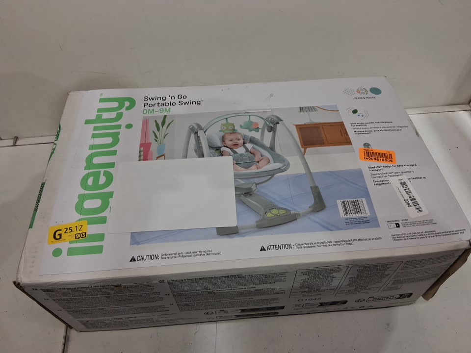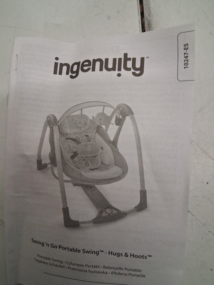 INGENUITY BRIGHT STARTS *battery operated* SWING 'N GO SWING WITH MULTIPLE SOUNDS/SWING SETTINGS, 20LBS CAPACITY - HUGS & HOOTS - GREY/TEAL/WHITE (MODEL: 10247-ES)