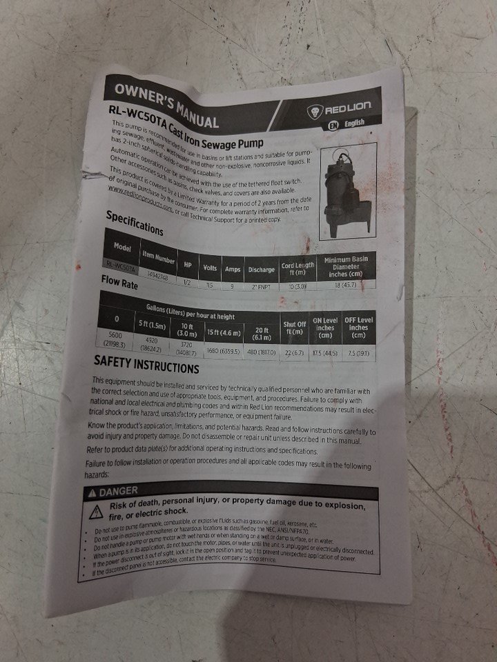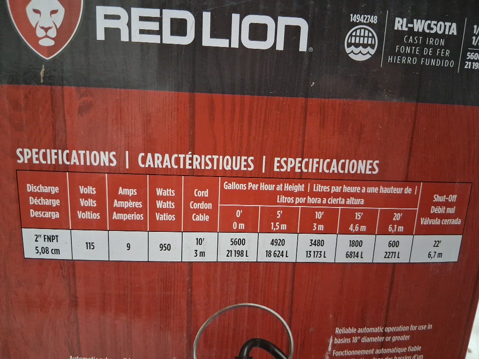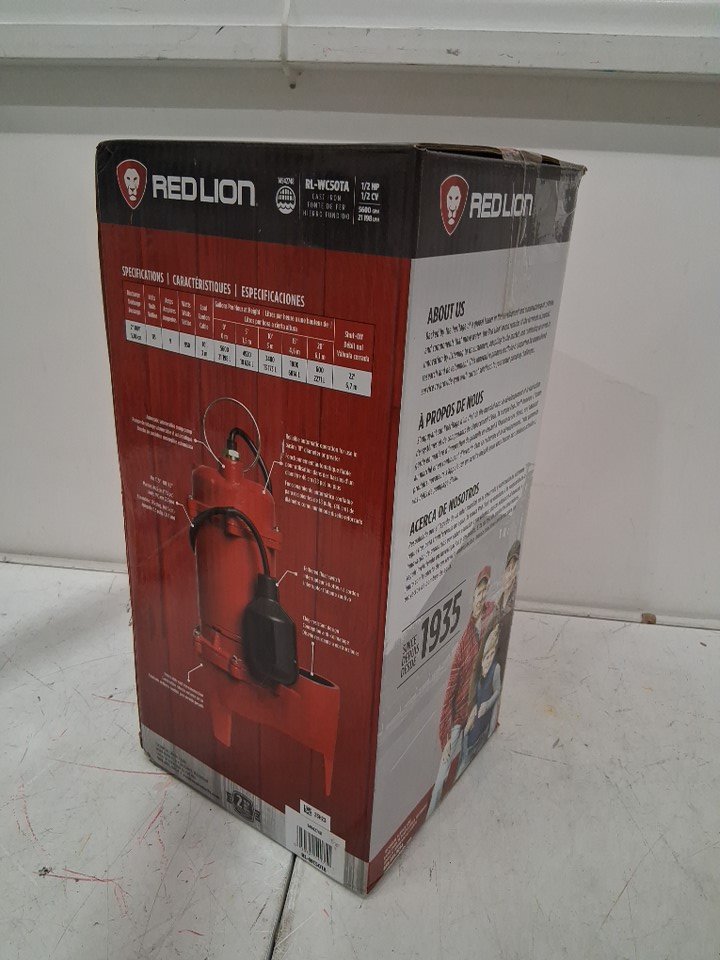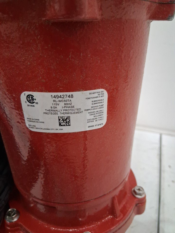 Red Lion cast iron Sewage Pump with Tethered Switch- 10ft cord -1/2hp - 5600gph- red (model:1494274800/rl-wc50ta)