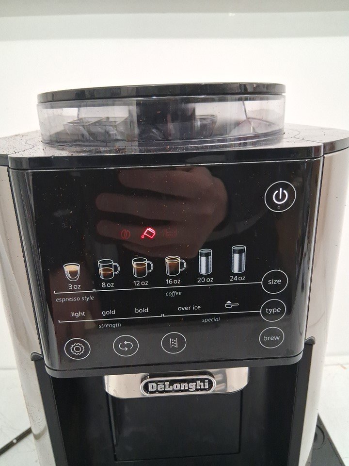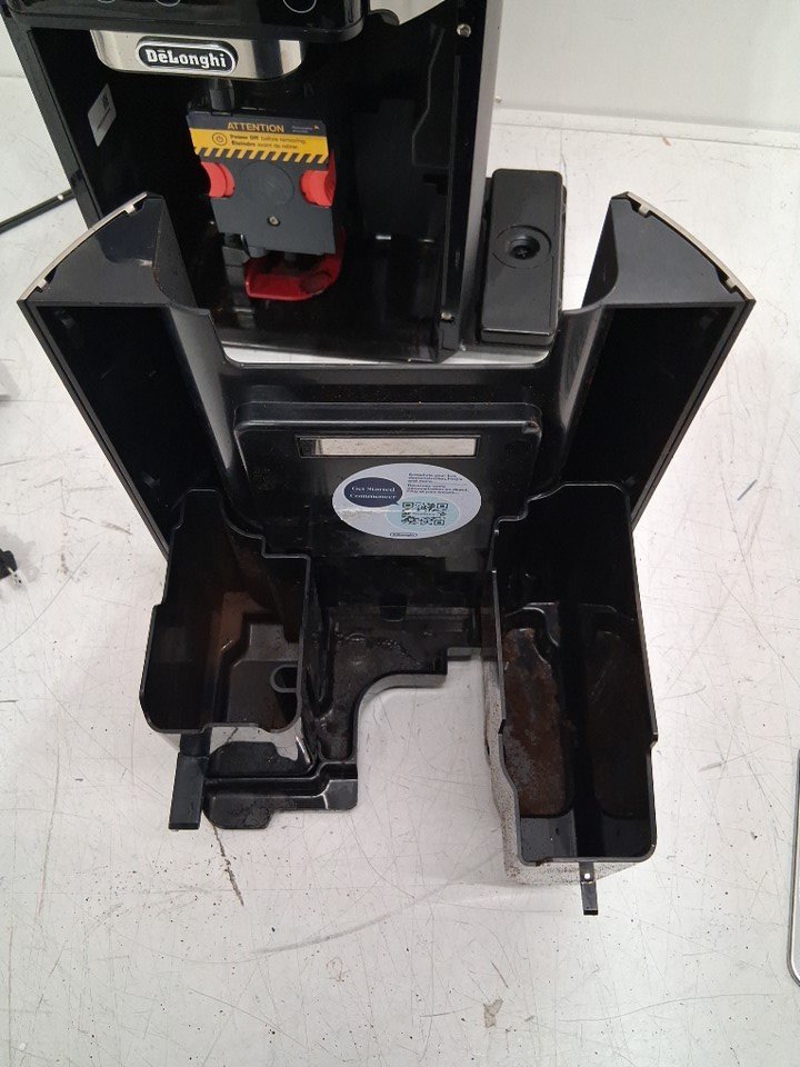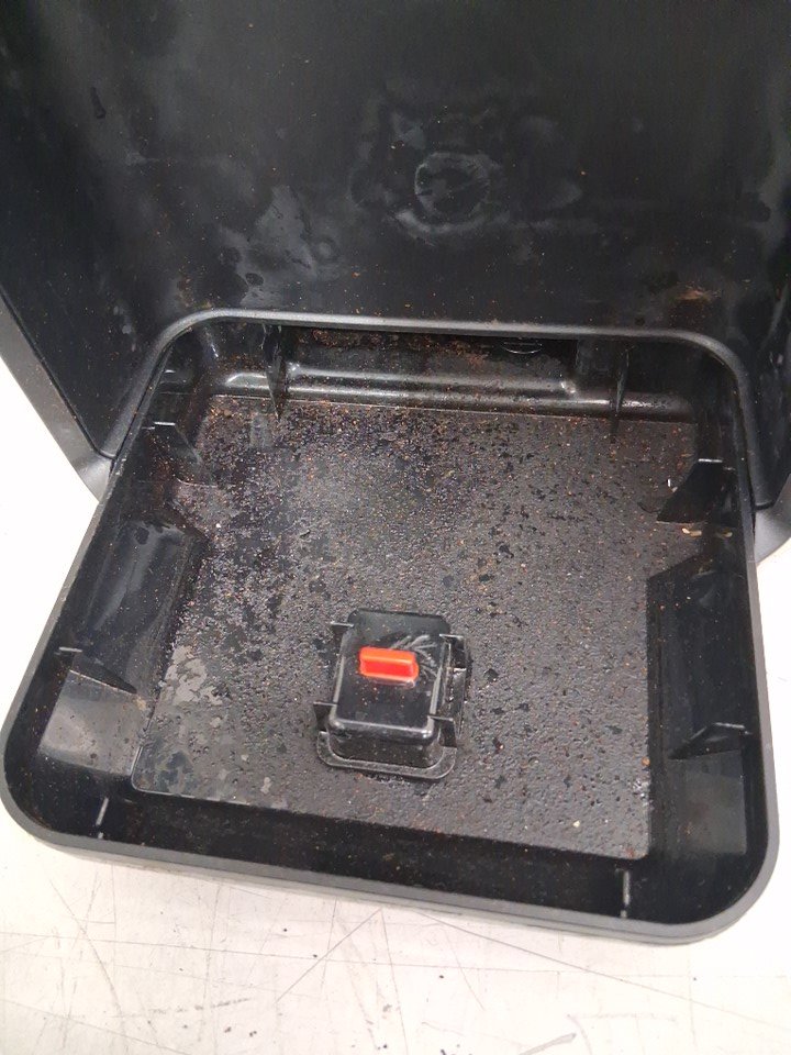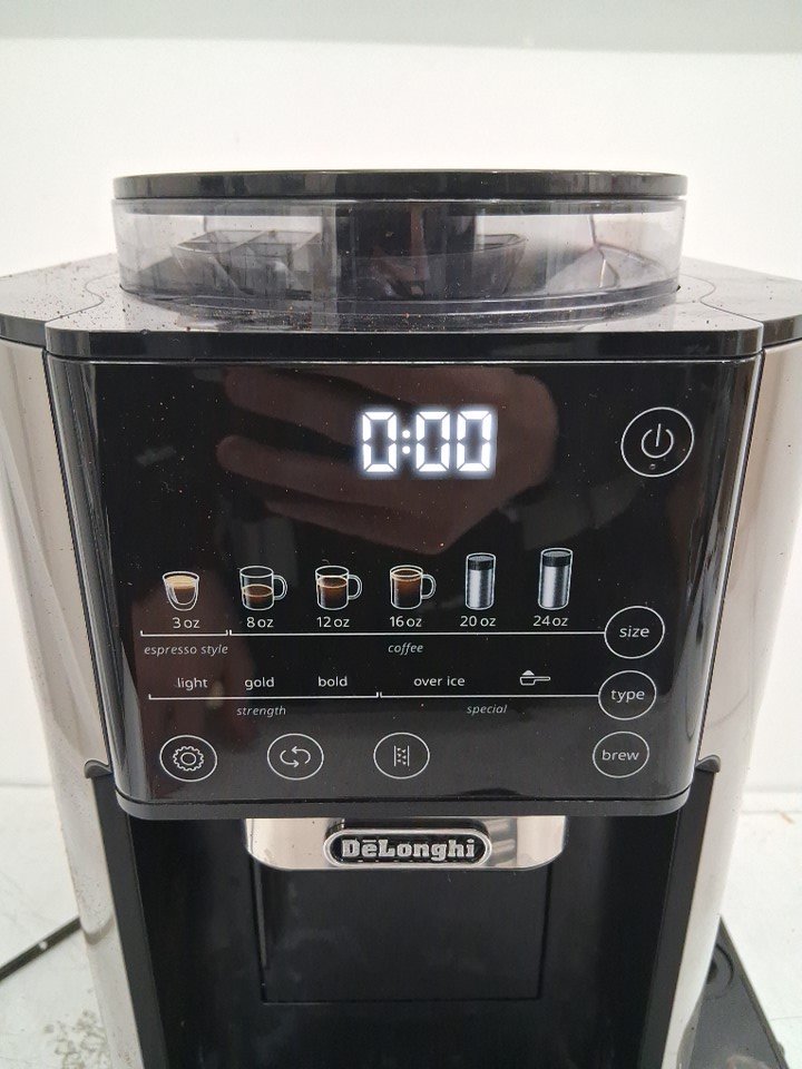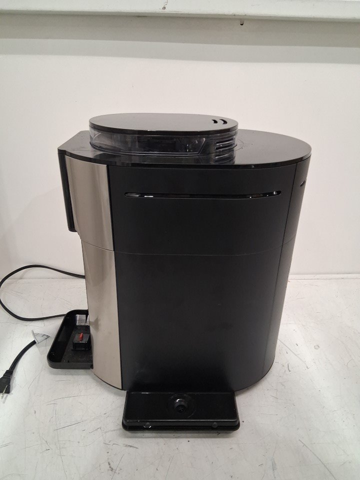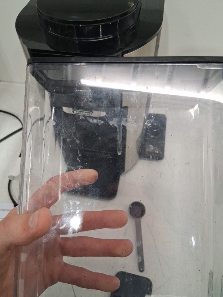 There is a heavy amount of coffee grinds/beans on various parts of the coffee maker due to previous use, there is also a small crack on the top under the lid, it doesn't look like the crack will affect use. Please note that the coffee maker will need a thorough cleaning before use. (Please see photos) The coffee machine was tested for basic power.