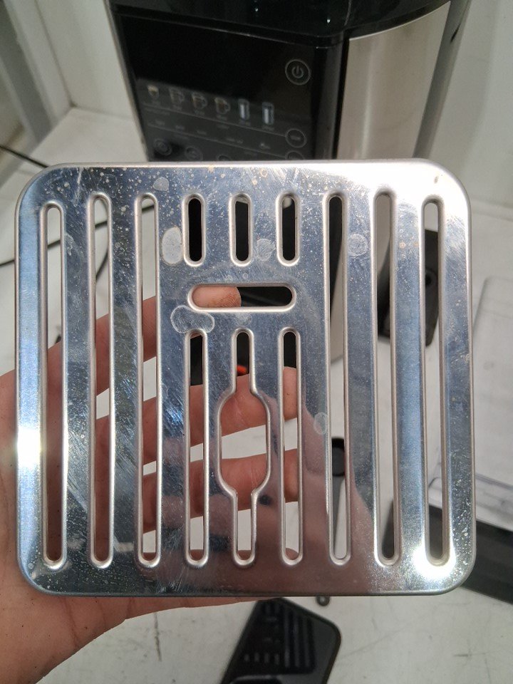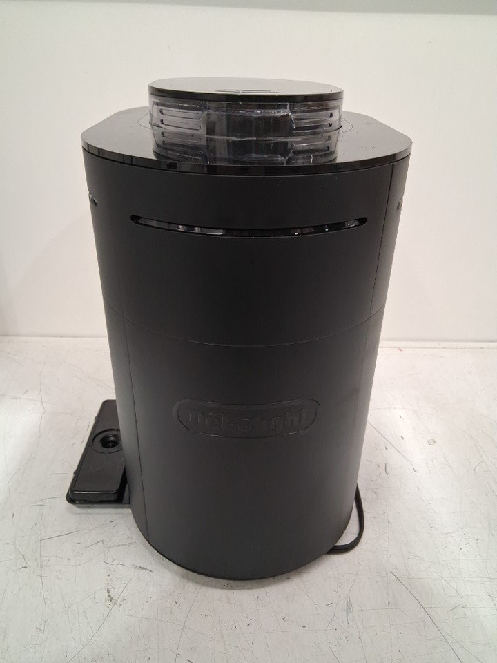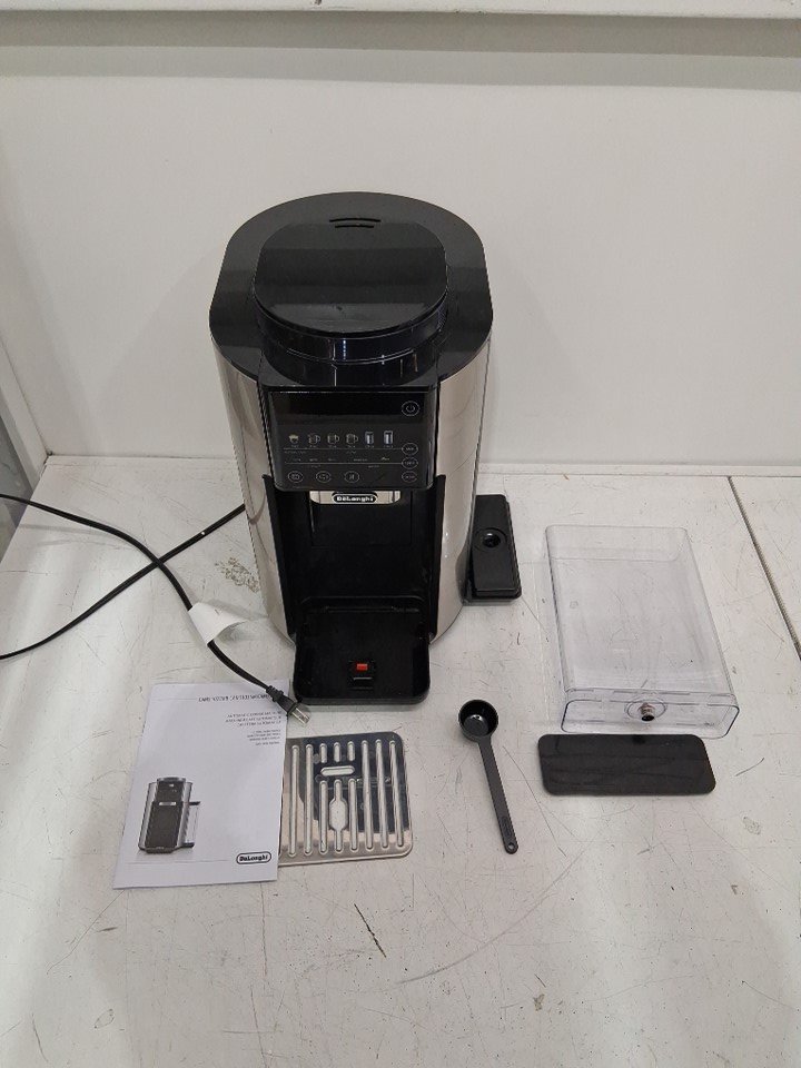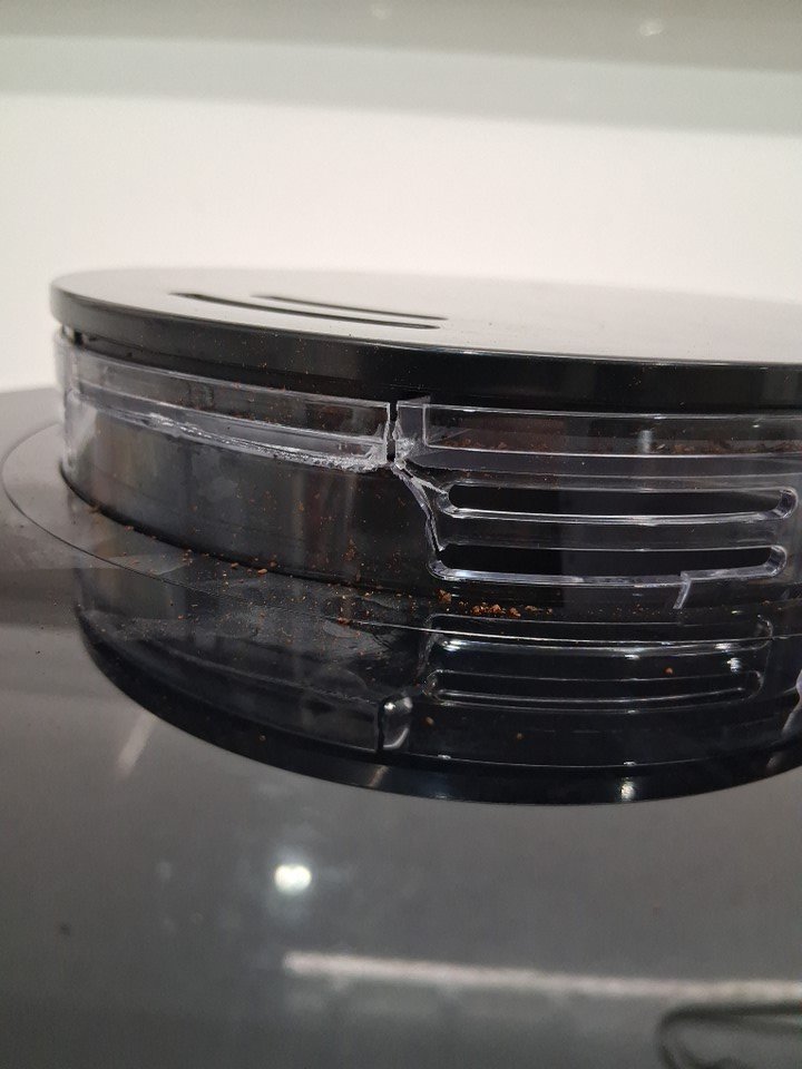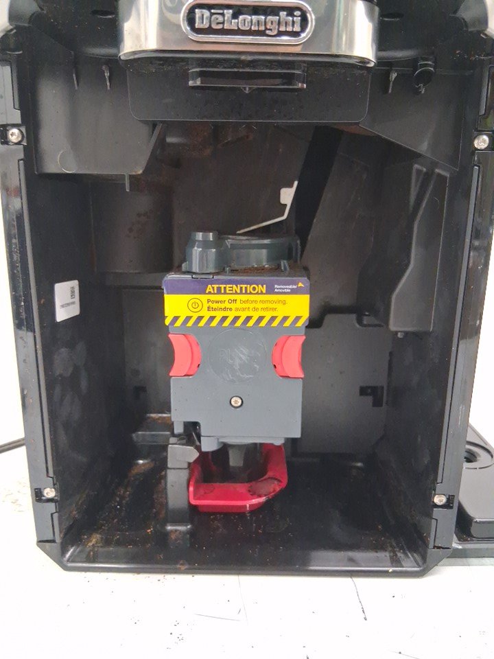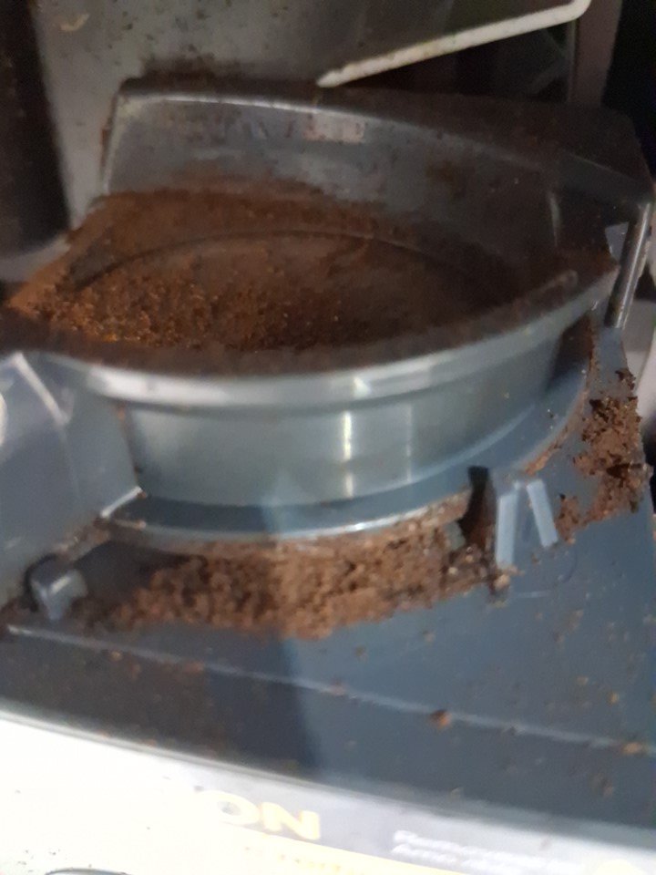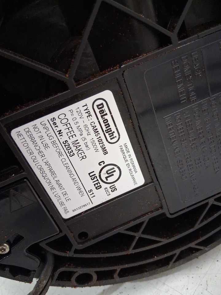 There is a heavy amount of coffee grinds/beans on various parts of the coffee maker due to previous use, there is also a small crack on the top under the lid, it doesn't look like the crack will affect use. Please note that the coffee maker will need a thorough cleaning before use. (Please see photos) The coffee machine was tested for basic power.