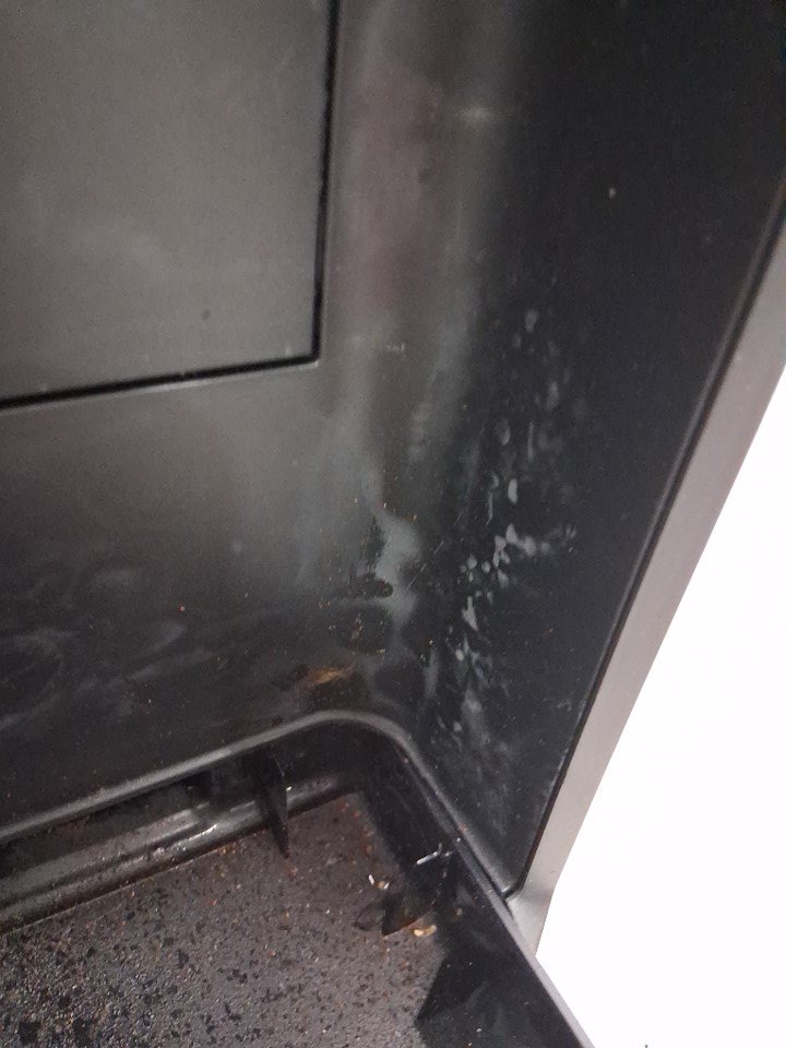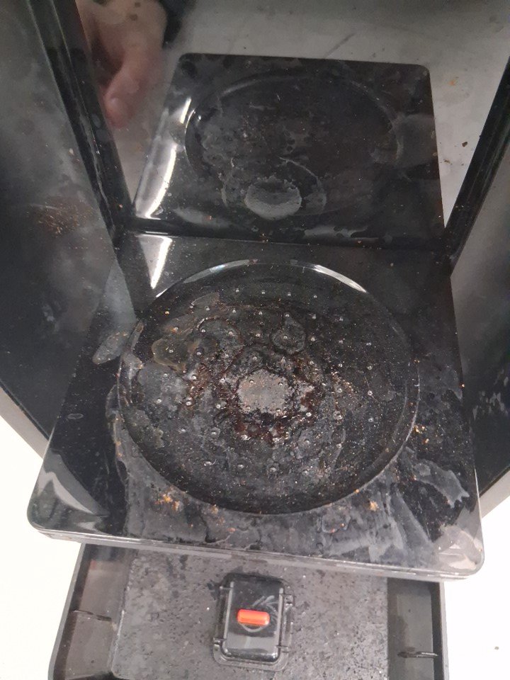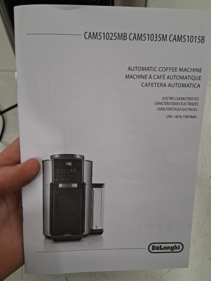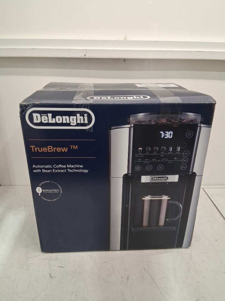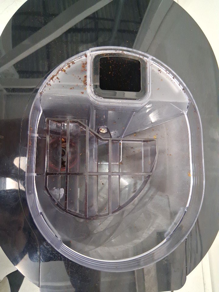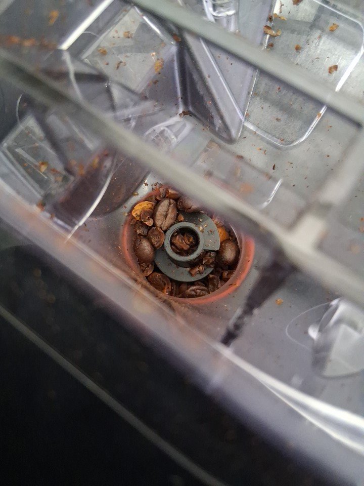 There is a heavy amount of coffee grinds/beans on various parts of the coffee maker due to previous use, there is also a small crack on the top under the lid, it doesn't look like the crack will affect use. Please note that the coffee maker will need a thorough cleaning before use. (Please see photos) The coffee machine was tested for basic power.