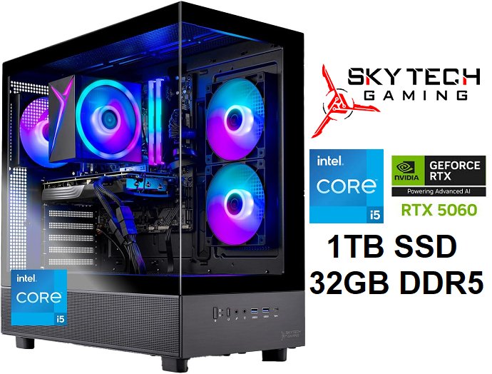 skytech azure 3 gaming pc - intel i5-14400f | rtx 5060 8gb | 1tb nvme | 32gb ddr5 - black