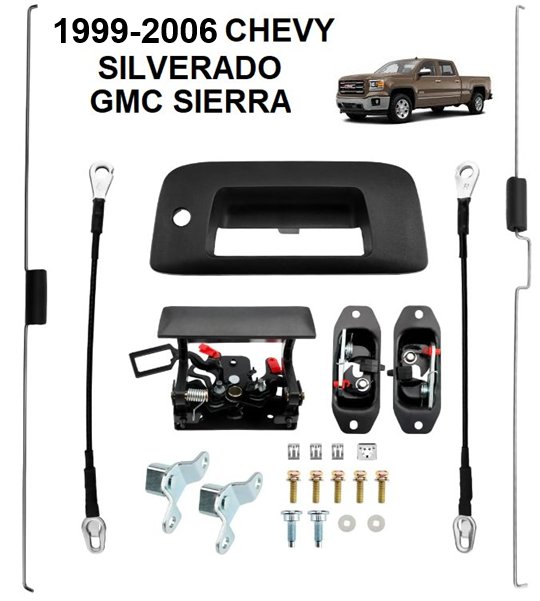 Tailgate Hardware Rebuild Kit Handle Bezel Latch Cables Rods Compatible with 1999-2006 Chevy Silverado GMC Sierra - (Model: GW-QXLB03)