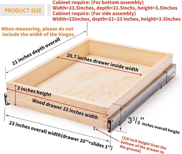 mulush pull out cabinet drawer organizer, soft close slide out wood drawer - 23" x 21" x 3" - finished wood (Model: MU-B2-23-CA)