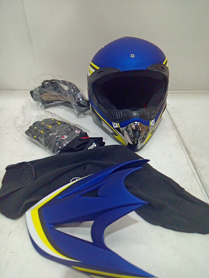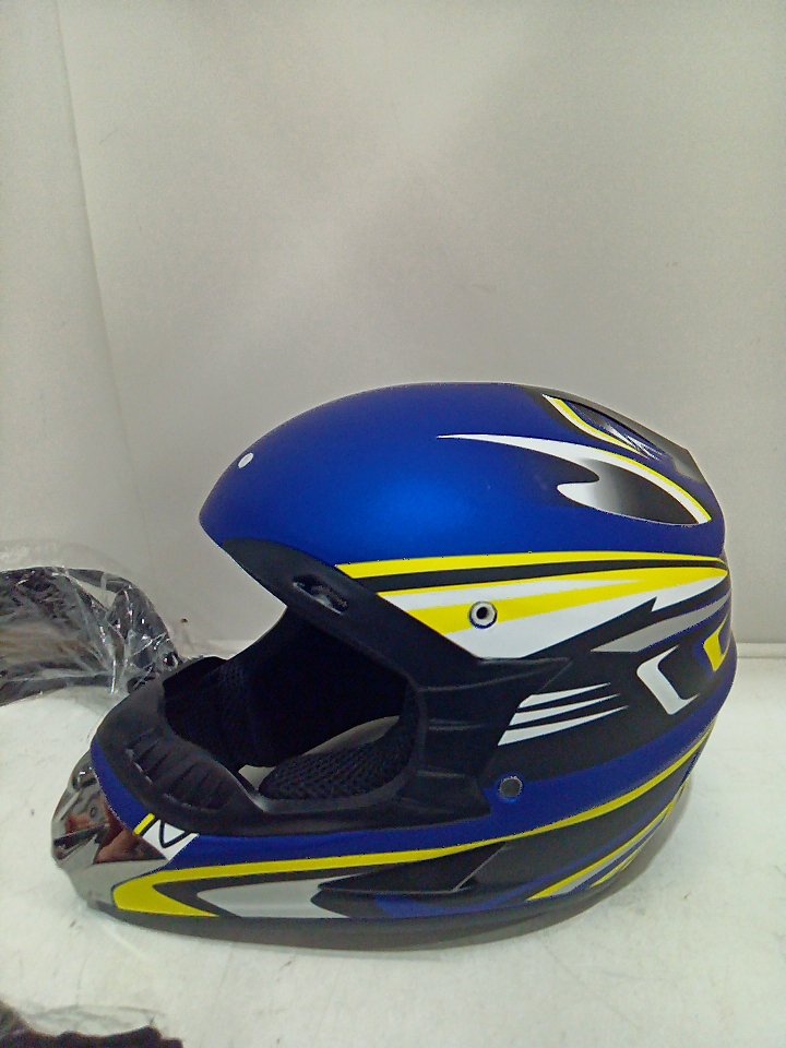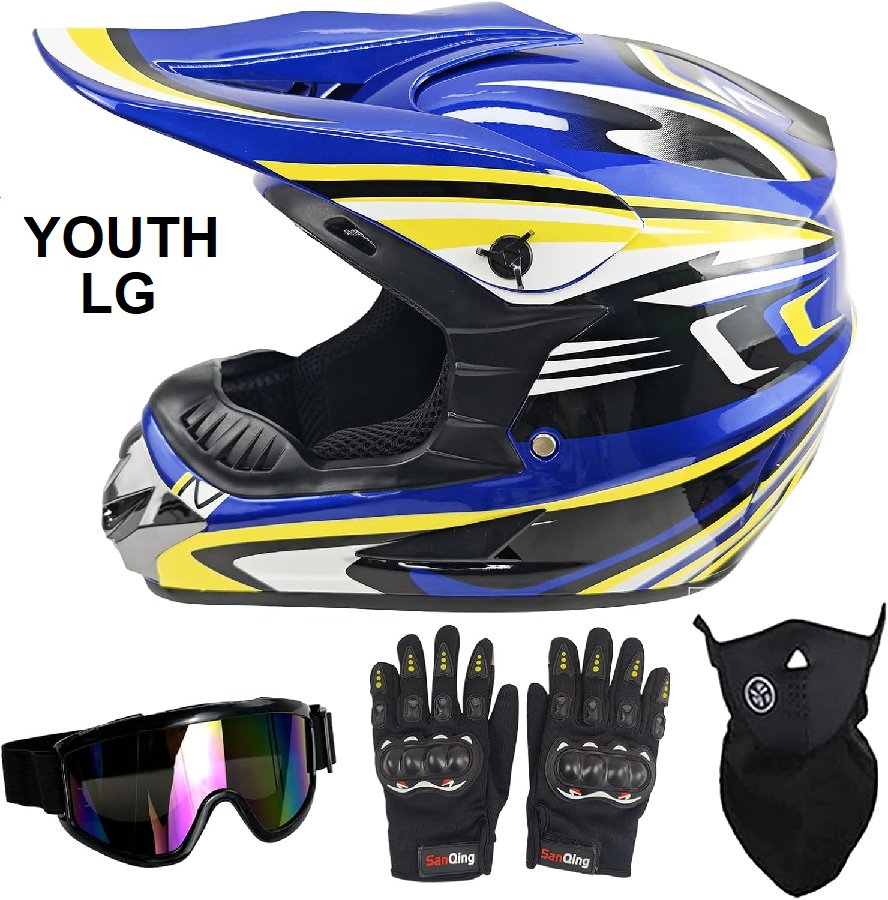 KIDS MOTORCYCLE DIRT BIKE HELMET - OFF ROAD MOUNTAIN BIKE, BMX, ATV HELMET FOR GIRLS AND BOYS - FULL FACE HELMET, GOGGLES, GLOVES - DOT CERTIFIED - LARGE - BLUE/WHITE/YELLOW