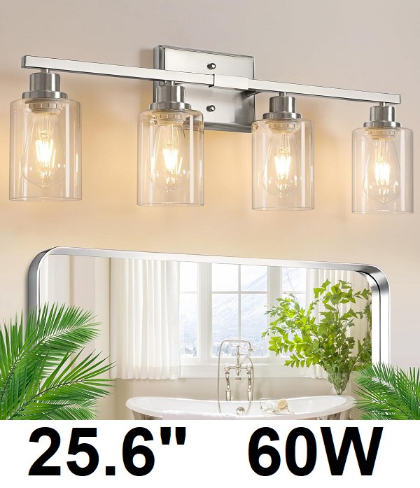 Ascher 4 Light Bathroom Modern Vanity Lights with Clear Glass Shade, 60W - 25.6" - Brushed Nickel - (MODEL: RJ-WS04)