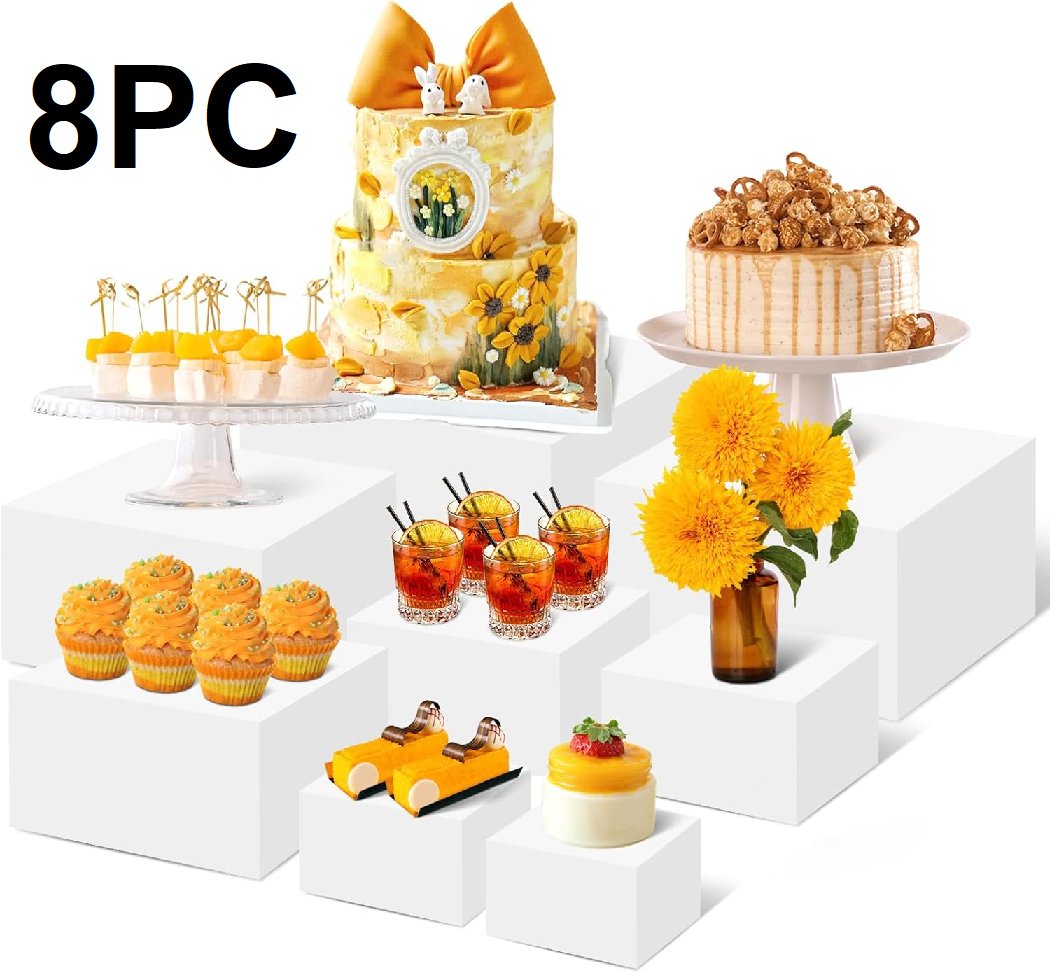 8PC BUFFET RISERS - ACRYLIC STAND DISPLAY BOXES FOR FOOD, CATERING, DESSERT, JEWELRY, FIGURES - VARIOUS SIZES - WHITE