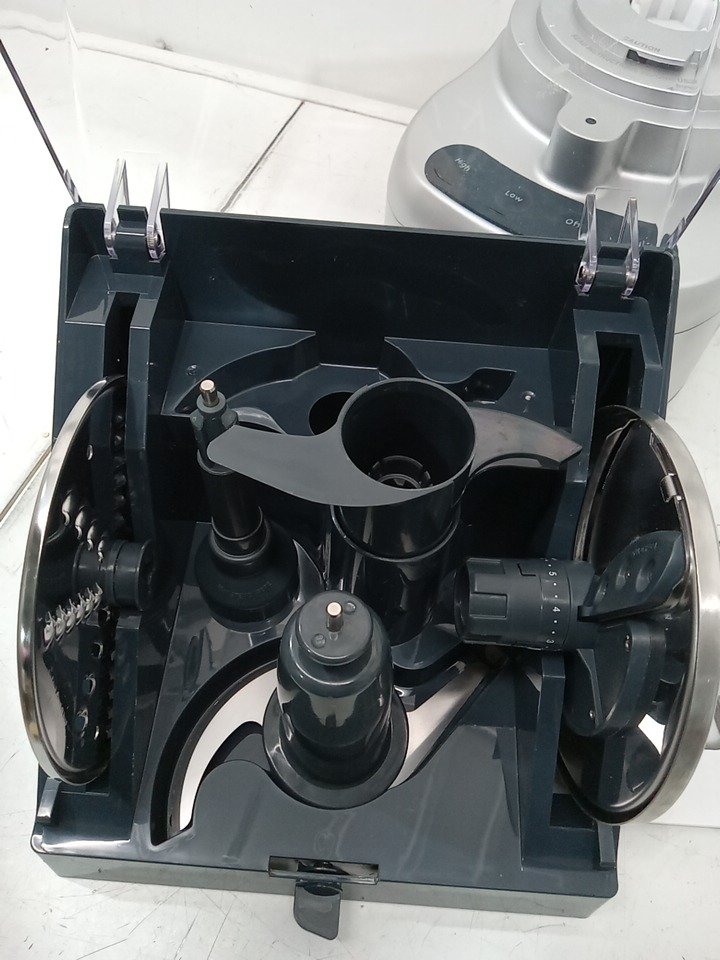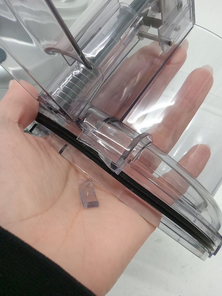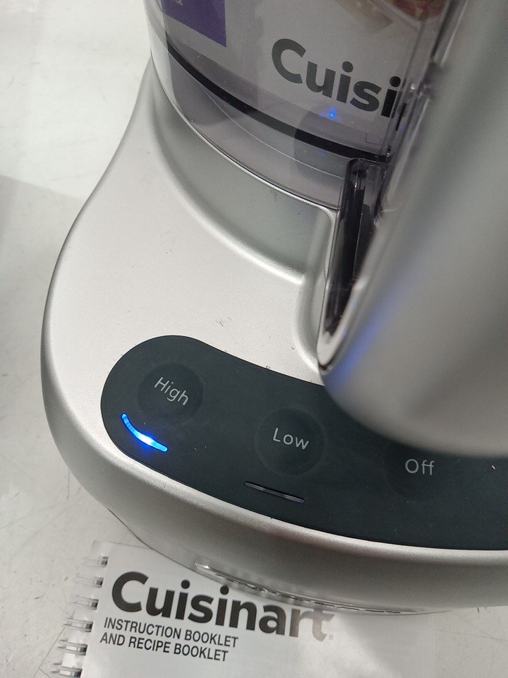 Has some stains marks. There is a small plastic piece broken from the lid, it does not affect it's fuction. Tested for power