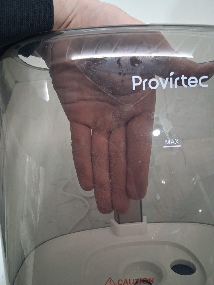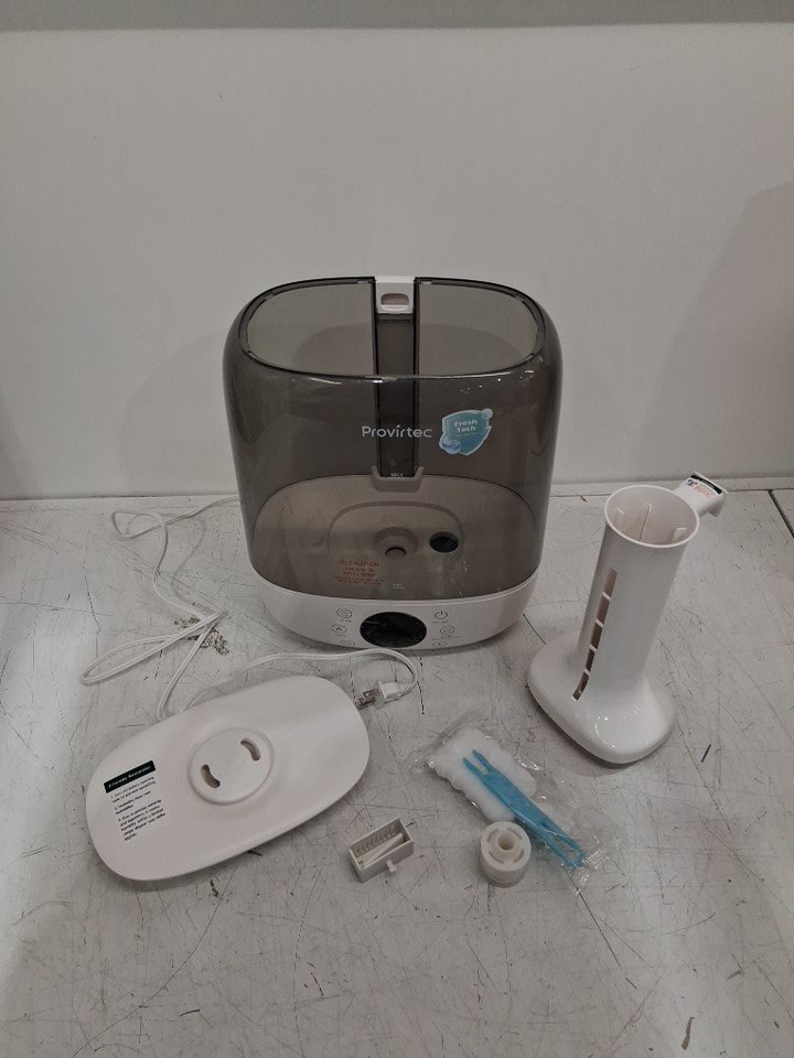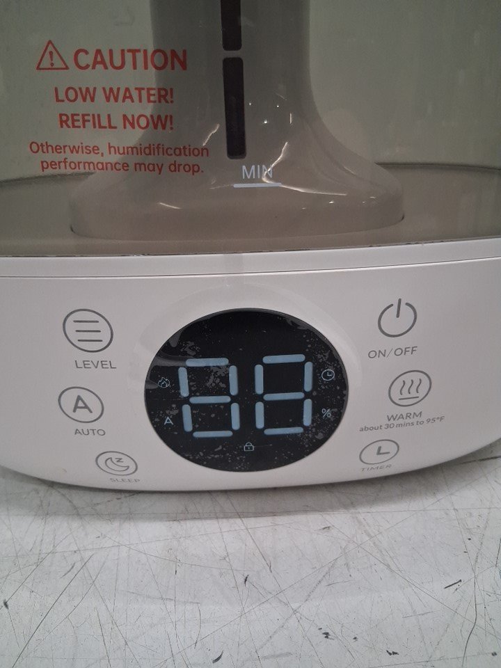 There is water residue on the tank due to previous use, and *the remote for the humidifier is missing as well*. The humidifier was tested for basic power.