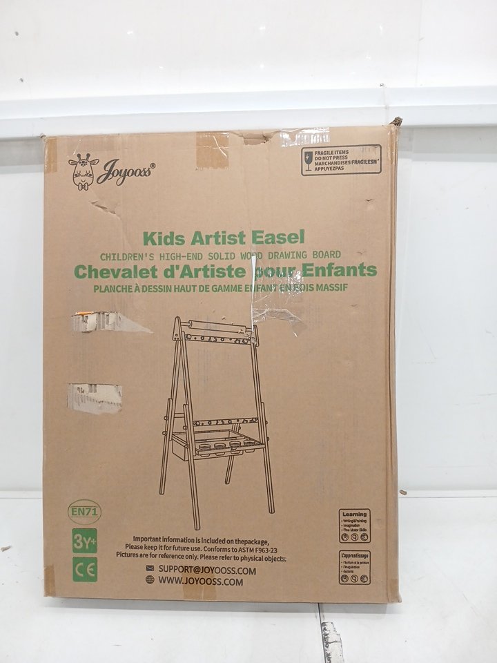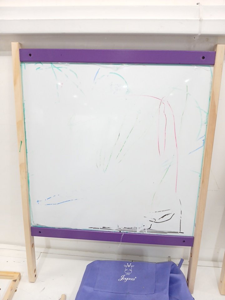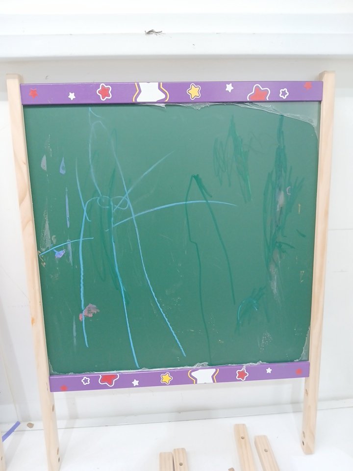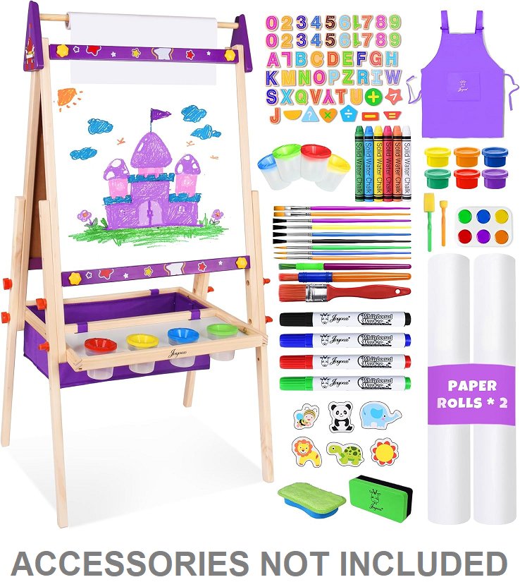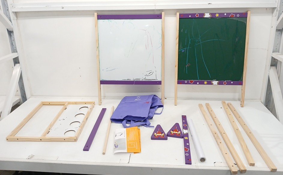 Accessories not included. This item is missing its purple bag that goes under the easel. This item has been heavily used as there is marker and chalk all over the boards and the apron is stained in paint