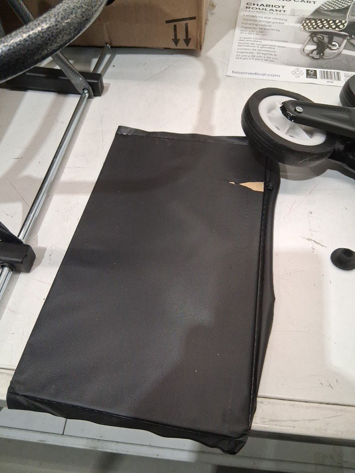 Scratch on bag bottom tray, may be missing hardware pieces but wheels seem to slip on just fine.