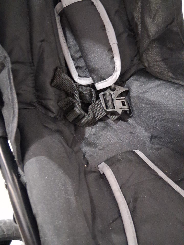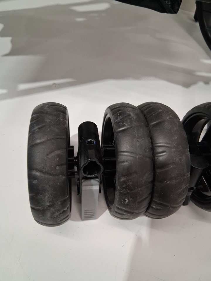 The wheels show use. The frame has some s=minor scuffing and the seat has some sand/debris inside.