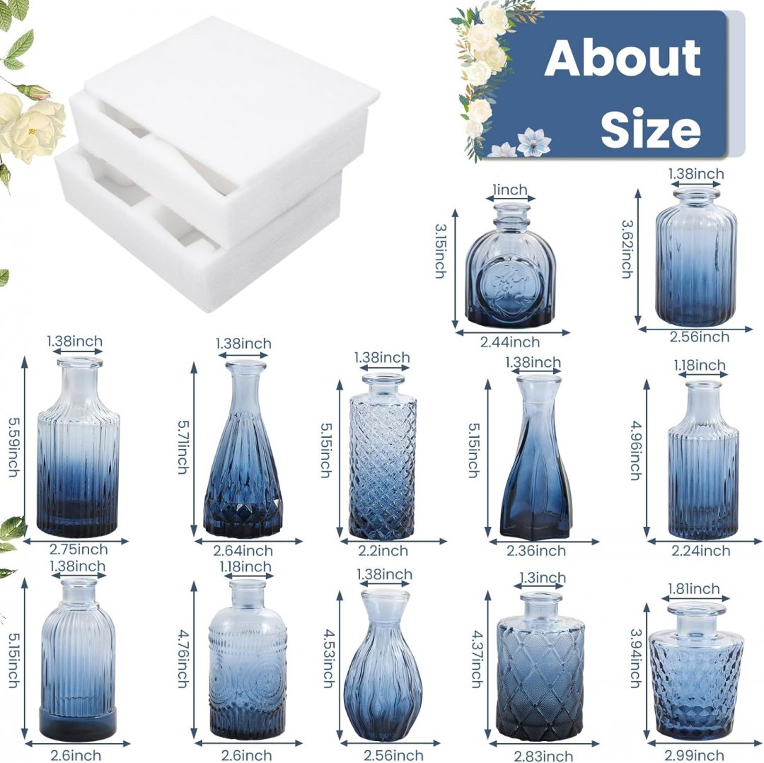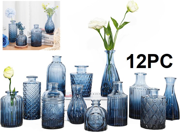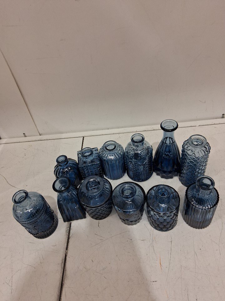 12pc tbwind Blue Glass Bud Vases Set - various sizes - transparent blue