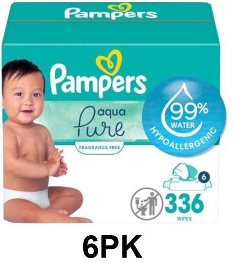 6PK Flip-Top baby PAMPERS aqua pure fragrance-free hypoallergenic wipes - 56 per pack (336 total) - white (model: 43220-8977)