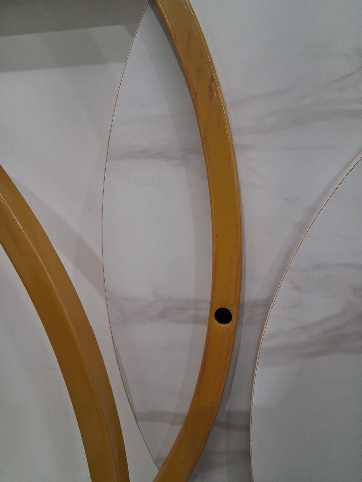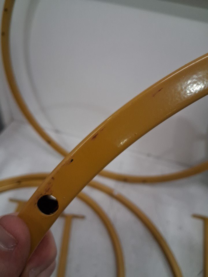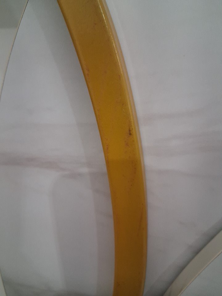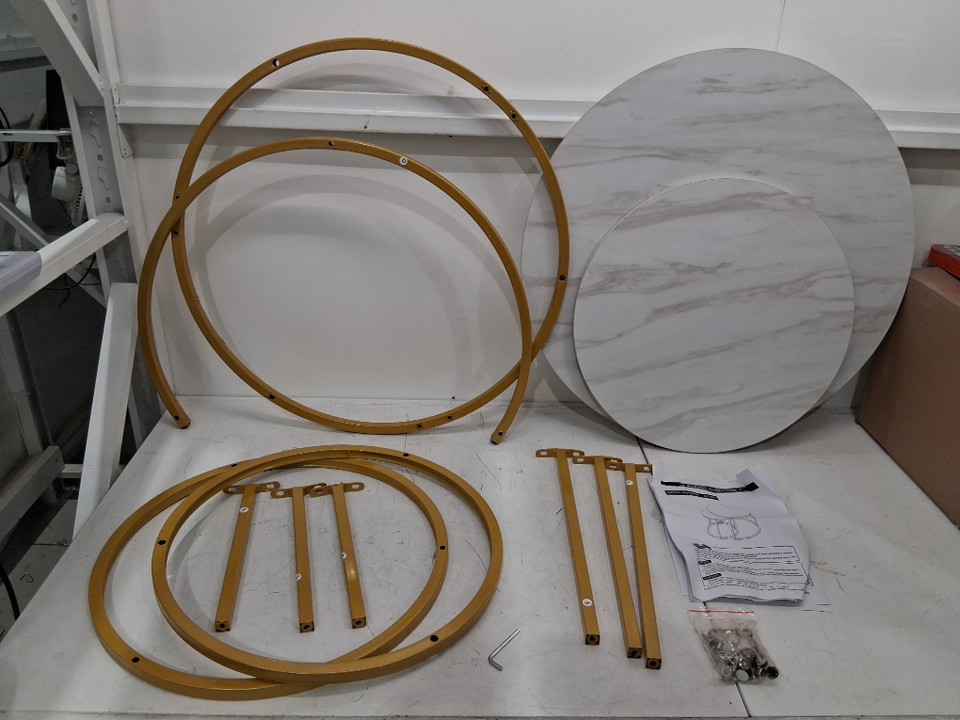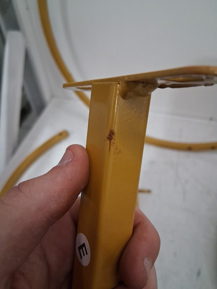 There are some rust/scuff marks some of the table's legs and there is one small faint scuff mark on the larger table that is barely noticeable. (Please see photos)