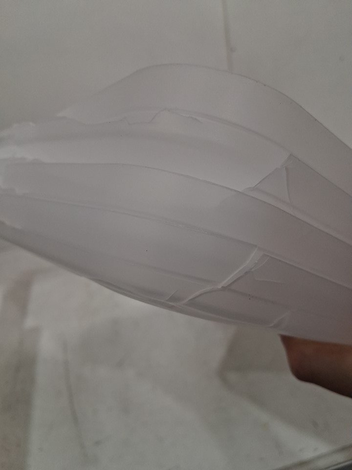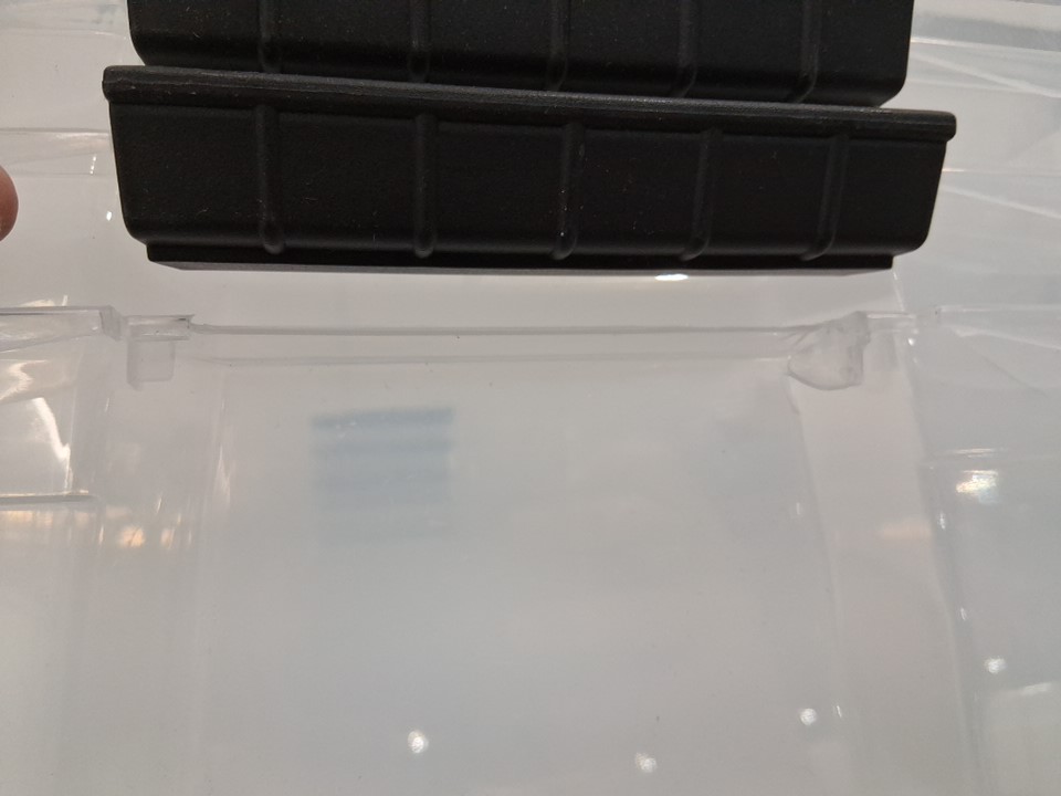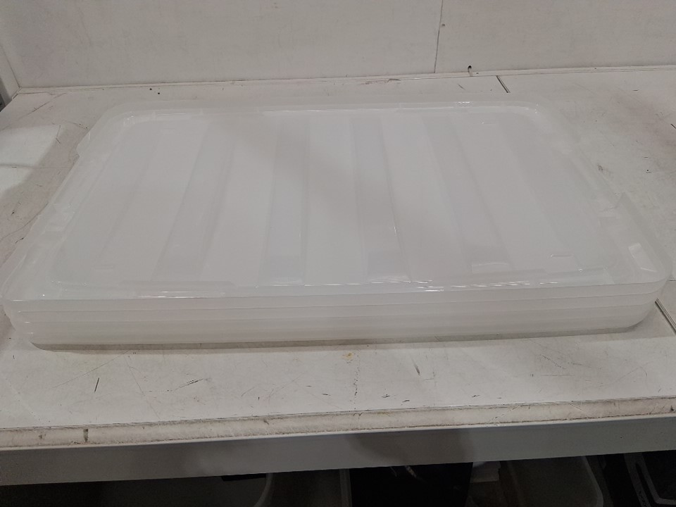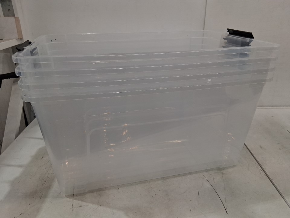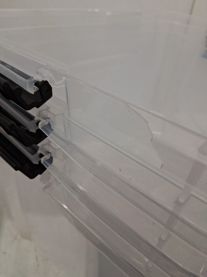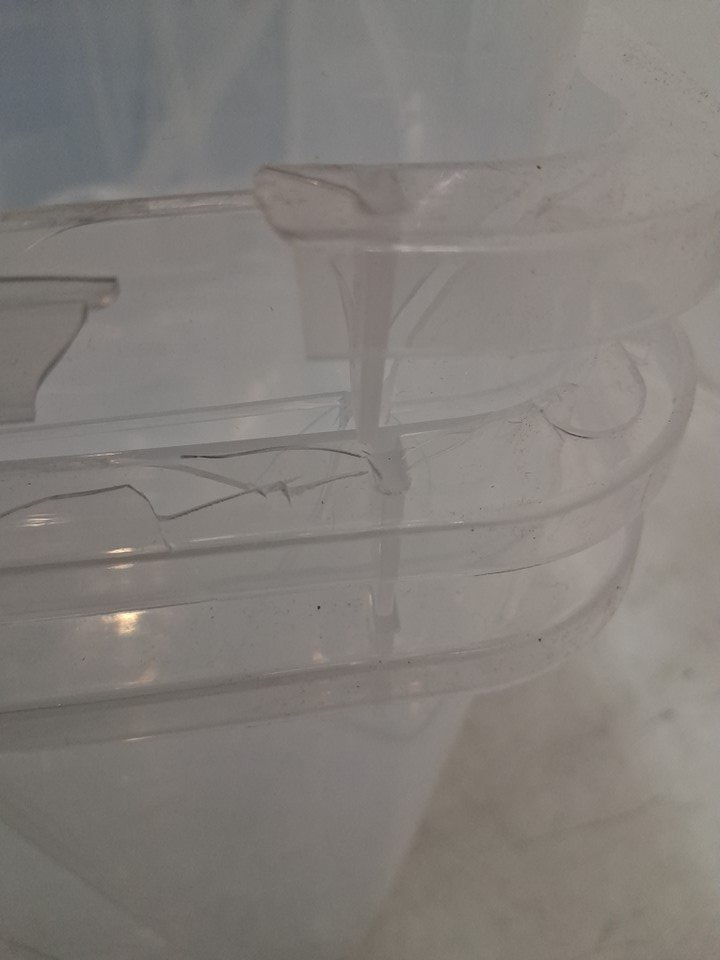 The edges of many of the bins and lids are cracked in various places due to shipping, as a result the latch on one side of one bin has fallen off and is missing from the packaging - see photos. This damage is limited to the edges, and should not heavily affect the structure of the bins or lids.