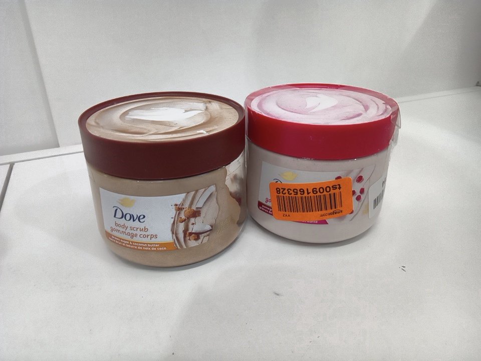 2PC DOVE BODY SCRUBS - 425G EACH - POMEGRANATE SEEDS & SHEA BUTTER / BROWN SUGAR & COCOA BUTTER - 425G/EACH
