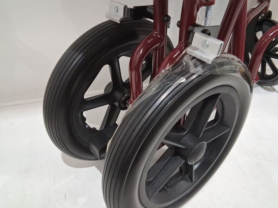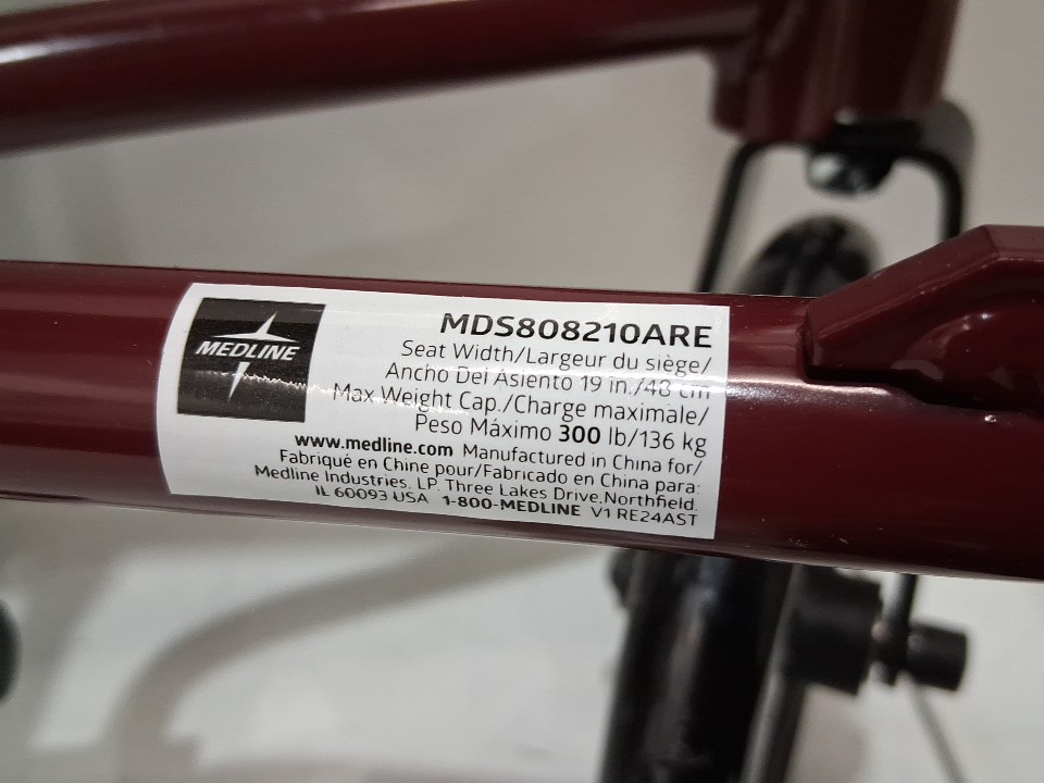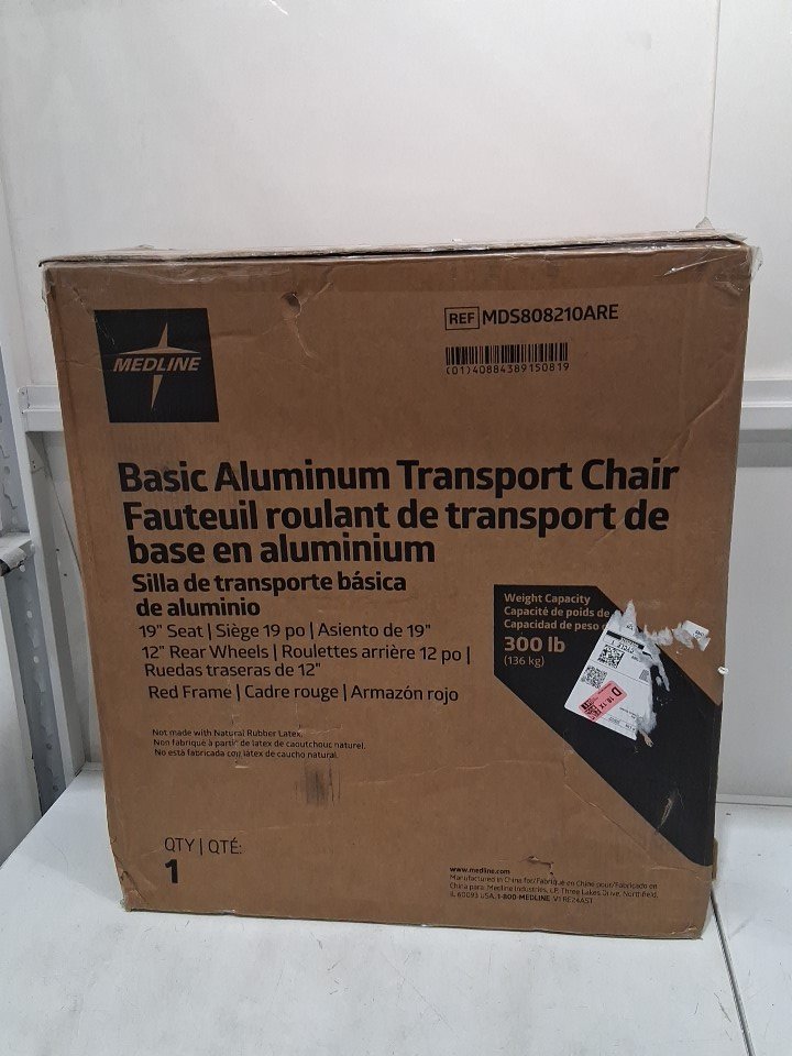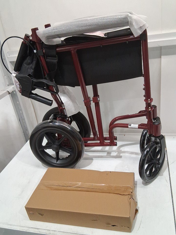 MEDLINE BASIC ALUMINUM TRANSPORT WHEELCHAIR - 19" - 12" REAR WHEELS WITH BRAKES - 300lbs capacity - RED (MODEL: MDS808210ARE)