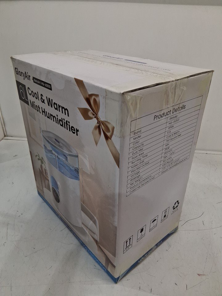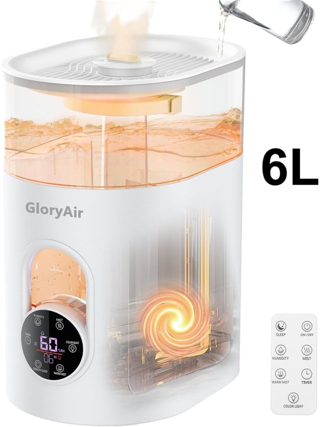 GloryAir Quiet Top Fill Cool & Warm Mist Humidifier with Smart Humidity Control, Remote Control, Humidistat and Oil Diffuser - 6 Litres - White (Model: HQ-JS2521)
