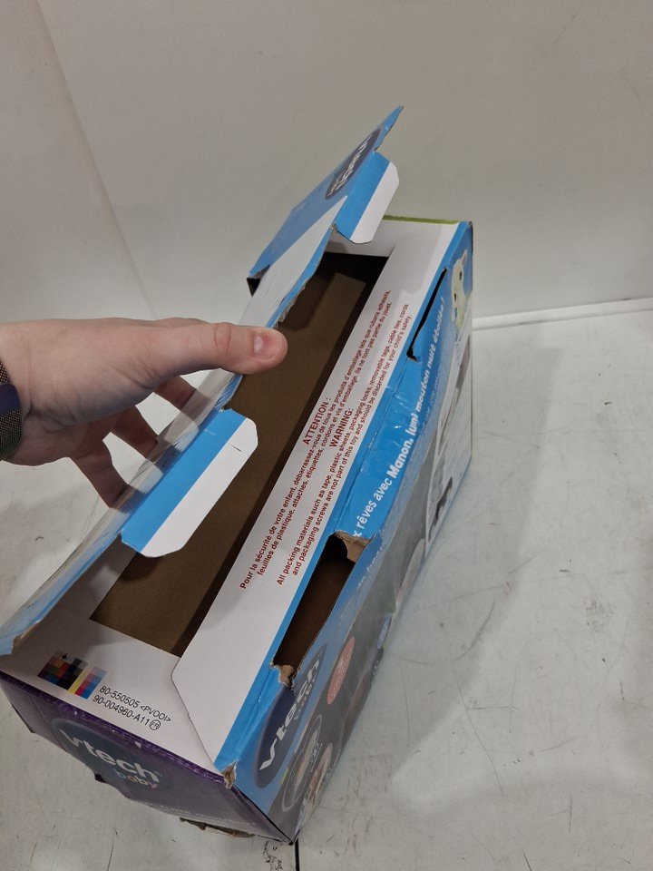 Item appears brand new and unused. However, packaging is distressed and open on the top, most likely from shipping.