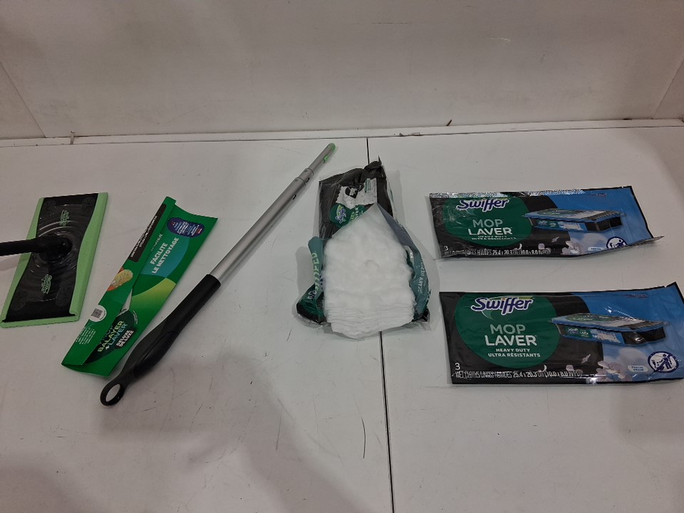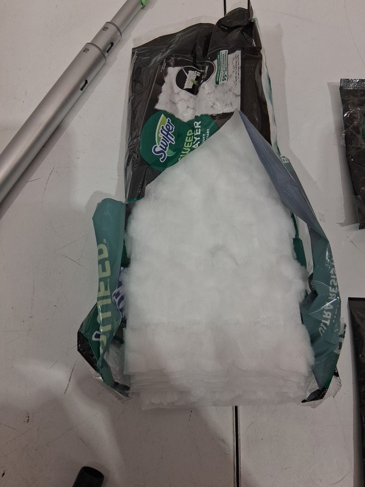 the dry mop heads is open but not missing any. one of the wet mops has a small cut in the packaging as well