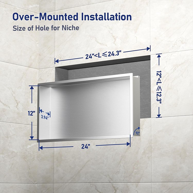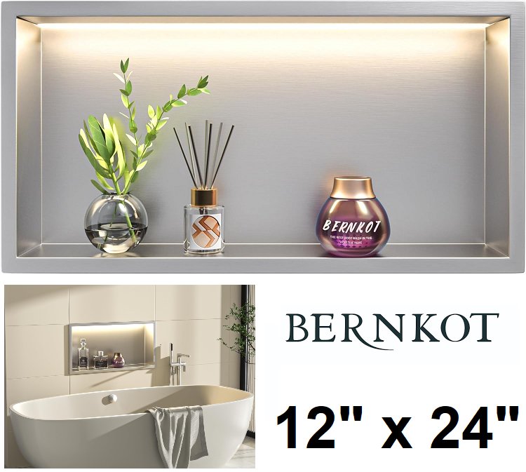 bernkot recessed shower wall niche with led light - 12"x24" 3000k - brushed stainless steel (model: bal-1224-br)