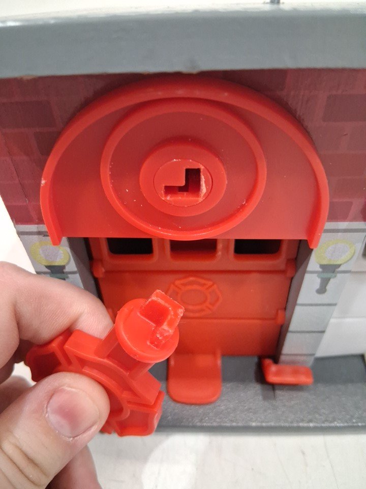Item has mild distress on red key end and keyhole. Does not impede function. Item does NOT include key ring.