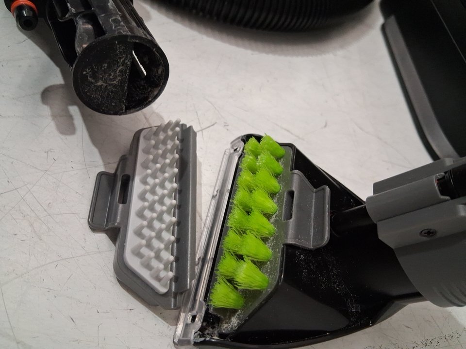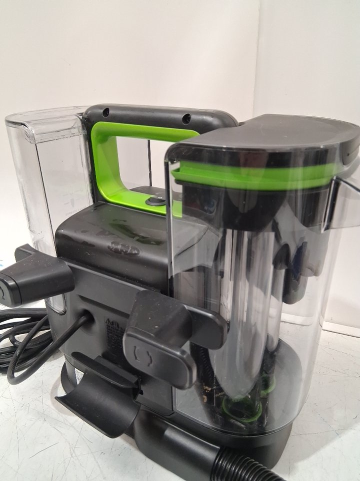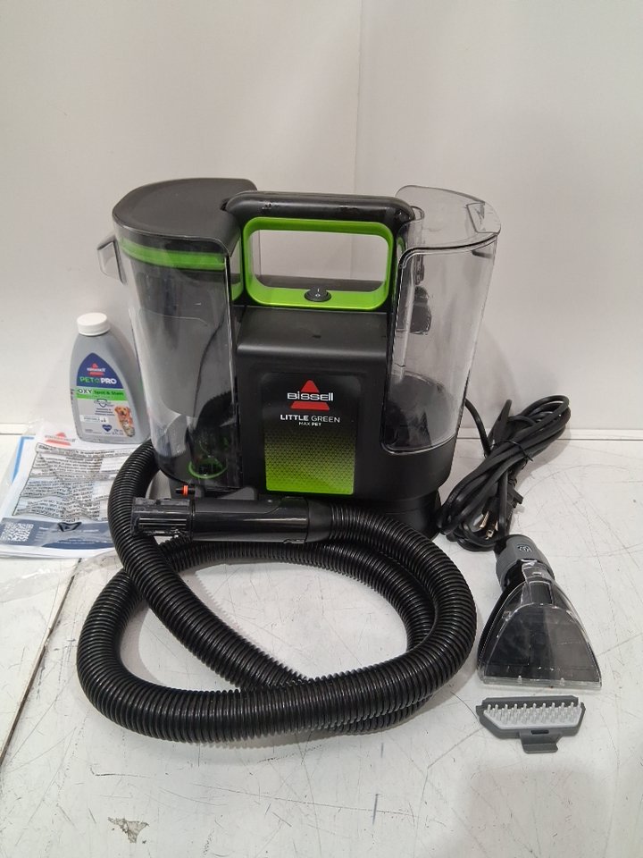 Please note that there is evidence of water in the tank (see photos). The cleaning solution is open and feels about 20% full, is replaceable: https://www.walmart.ca/en/ip/BISSELL-ADVANCED-PET-PRO-OXY-Urine-Eliminator-Formula-50-oz/6000200192525?selectedSellerId=0&wl13=1012