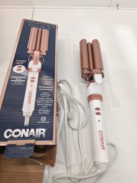 CONAIR DOUBLE CERAMIC TRIPLE BARREL CURL STYLING WAVER FOR DEEP WAVES - 3/4" BARRELS - WHITE/ROSE GOLD - (MODEL: CD704C)