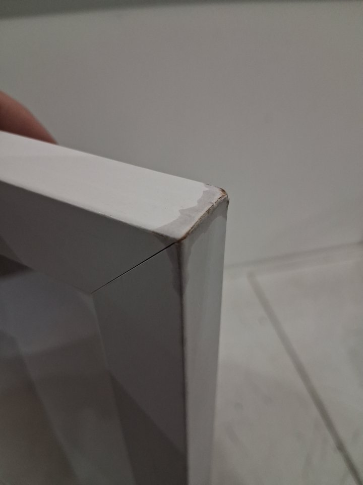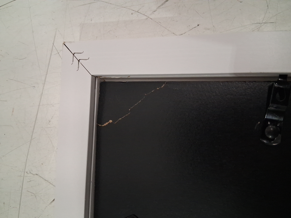 Please note the frame has a loose connection on one corner and some apparent water damage on another. There is also a crack on the back of the frame, see photos.