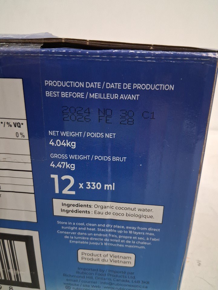 12PK *Recently Expired* Rubicon 100% Natural Organic Coconut Water - 330ml (EACH) - 3960Ml Total