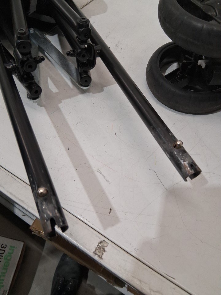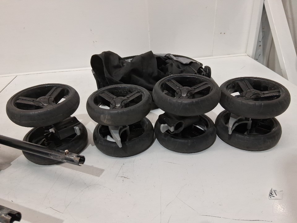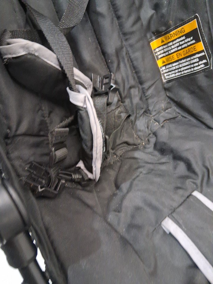 Heavy use, scraped legs, worn wheels, crumbs and debris.