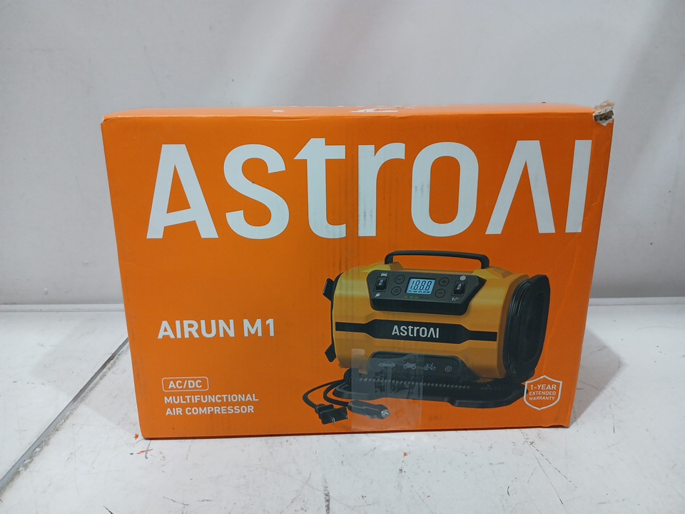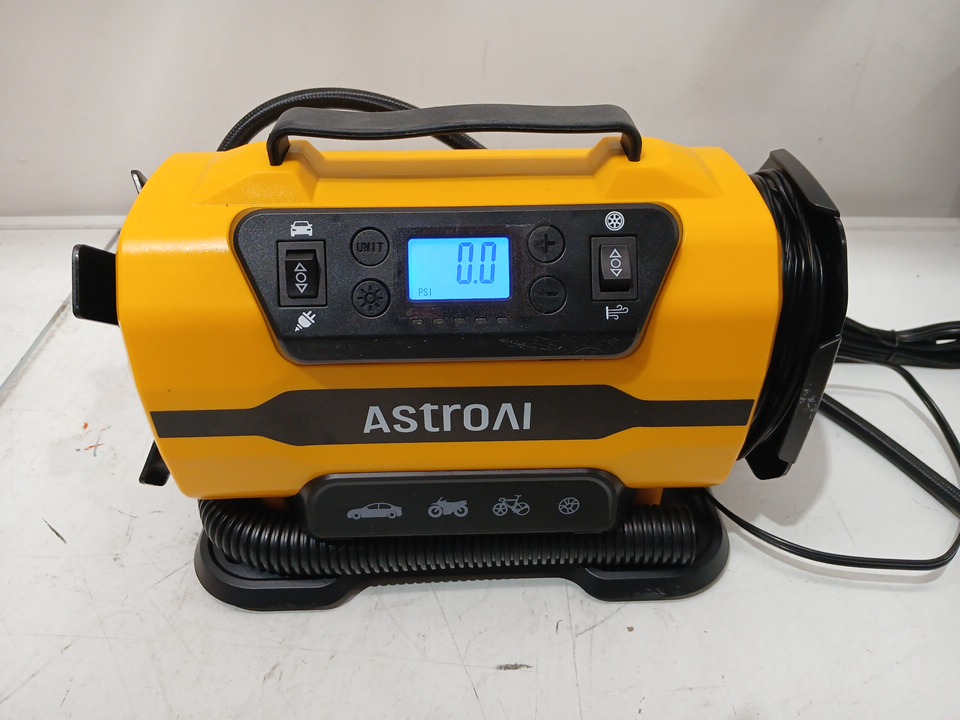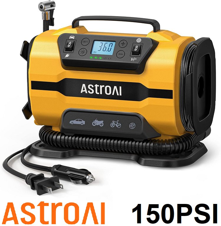 astroai multi-functional portable air compressor with dual metal motors & led light - 150psi fast inflation & 12v dc/110v ac - yellow/black (model: ATJ-8366)